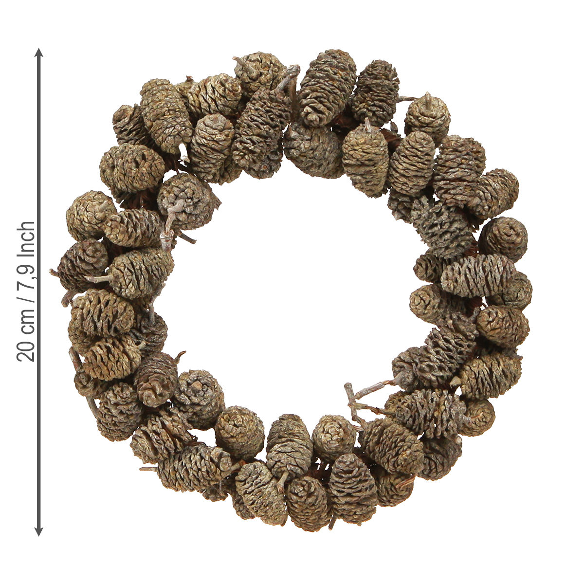 This decorative piece, made from a Styrofoam wire base and tastefully complemented by alder cones and jute, is versatile and durable. The white wash effect gives the wreath a wintry yet timeless appeal. Whether as a door wreath made of natural material for the entryway, as a hanging wreath made of alder cones in the living room, or even as a simple wall decoration in autumn – its uses are endless.
