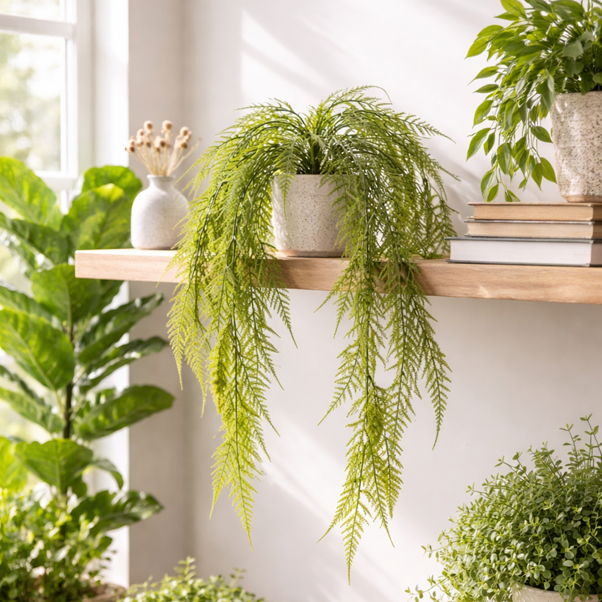 Place the hanging plant above a sideboard, a chest of drawers, or in the entryway. It also looks fantastic in hanging planters or as a decorative accent on balcony railings. Those who love an urban jungle style can combine the asparagus fern with other green hanging plants to create a striking, natural effect.