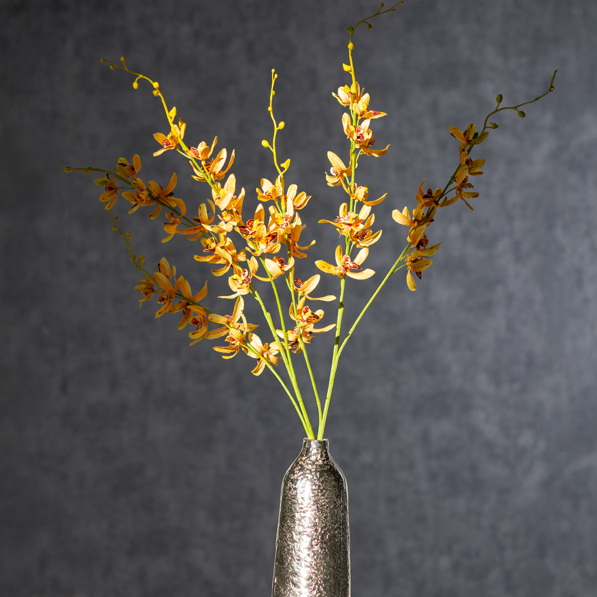 The Cymbidium orchid is considered a symbol of elegance and sophistication. Thanks to its high-quality craftsmanship, it is virtually indestructible yet a true eye-catcher. The combination of yellow silk fabric, which provides an authentic feel, and a flexible plastic stem makes it not only visually appealing but also practical for your creative projects. Use it to decorate large vases or combine the orchid with green branches and other artificial flowers for impressive arrangements.