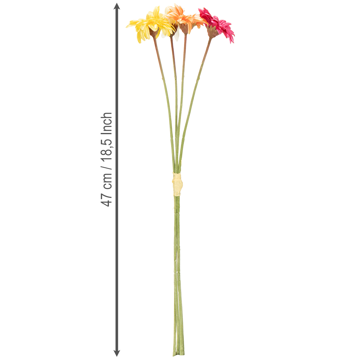 Vibrant gerberas in lasting beauty – who says only real flowers can impress? With our artificial gerbera bouquet, you can transform any room into a colorful oasis without having to worry about water, light, or maintenance. Whether in the living room, on the windowsill, or as the highlight of your wedding – these magnificent blooms look stunning everywhere! Honestly, haven't you always wanted a bouquet that always looks fresh? The versatile color scheme is especially practical: each gerbera comes in elegant yellow, cheerful orange, delicate white, or vibrant pink. Together, they create a harmonious overall look that integrates effortlessly into any interior style, from modern to country. And at 47 cm long, the bouquet is ideal for all types of vases. Let your creativity flow and create a home that will inspire with these extraordinary blooms!