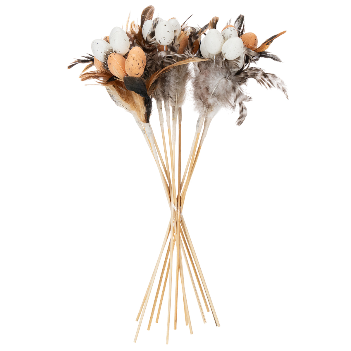 Artificial quail eggs, decorative feathers on a stick, 36cm, 12 pieces