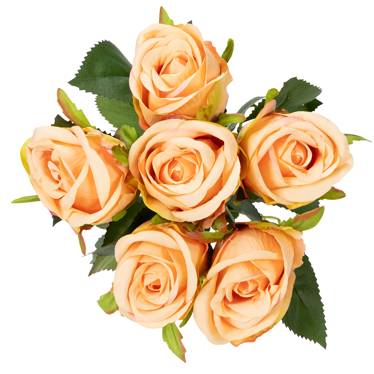 Measuring 44 cm in height and 10 cm in diameter, this rose bouquet fits perfectly in medium to large vases or can be creatively incorporated into a floral arrangement. The six artfully crafted roses, with their delicate pink tones and natural green leaves, create a harmonious composition that exudes pure elegance. Each leaf and bloom is meticulously crafted to capture the natural charm of real flowers. Made from polyester and plastic, this bouquet is not only visually appealing but also extremely durable. No wilting leaves, no drying out, and no allergies – a clear advantage over real flowers. With just a little dusting, it will remain beautiful for many years, making it perfect for those who value sustainable decoration. Combine the bouquet with other artificial flowers from our collection or use it as a striking centerpiece – the possibilities are virtually endless!