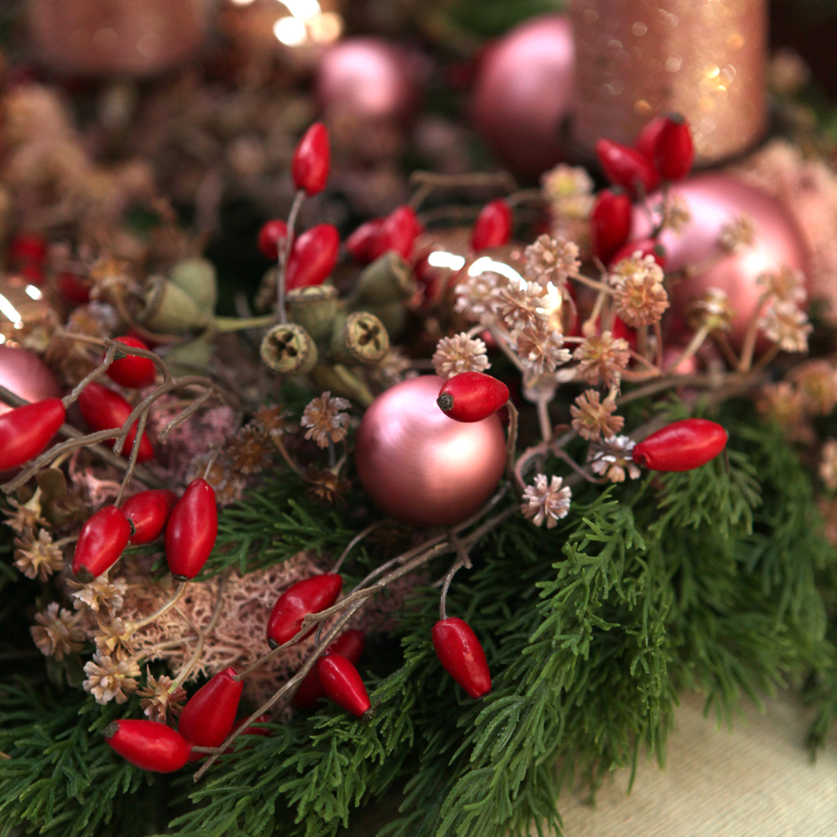 The color red symbolizes warmth and passion, perfectly suited to the cozy atmosphere of autumn. Rose hips also represent themes such as renewal and fertility. Red accents lend any room a vibrant and positive aura. Especially during the darker seasons, a red wreath brings a vibrant and energetic touch to your home.