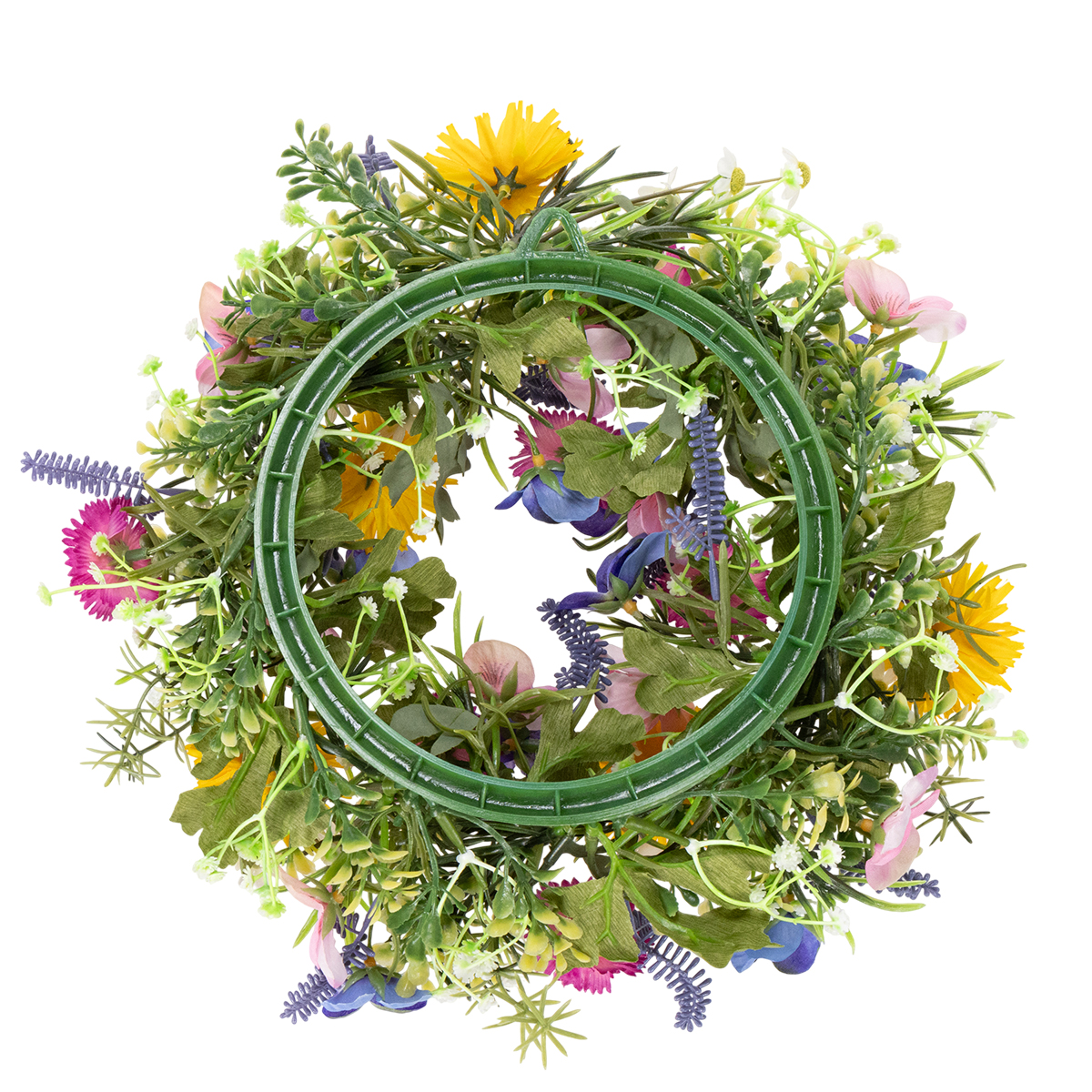 This artificial flower wreath unites the beauty and symbolism of spring in one accessory. The yellow blossoms represent energy and joie de vivre. Pink hues add a romantic, delicate touch, expressing harmony and love. The vibrant purple brings creativity and playfulness, while the green leaves symbolize the freshness and renewal of spring. This variety of colors creates a harmonious blend that will make your decoration a true highlight.