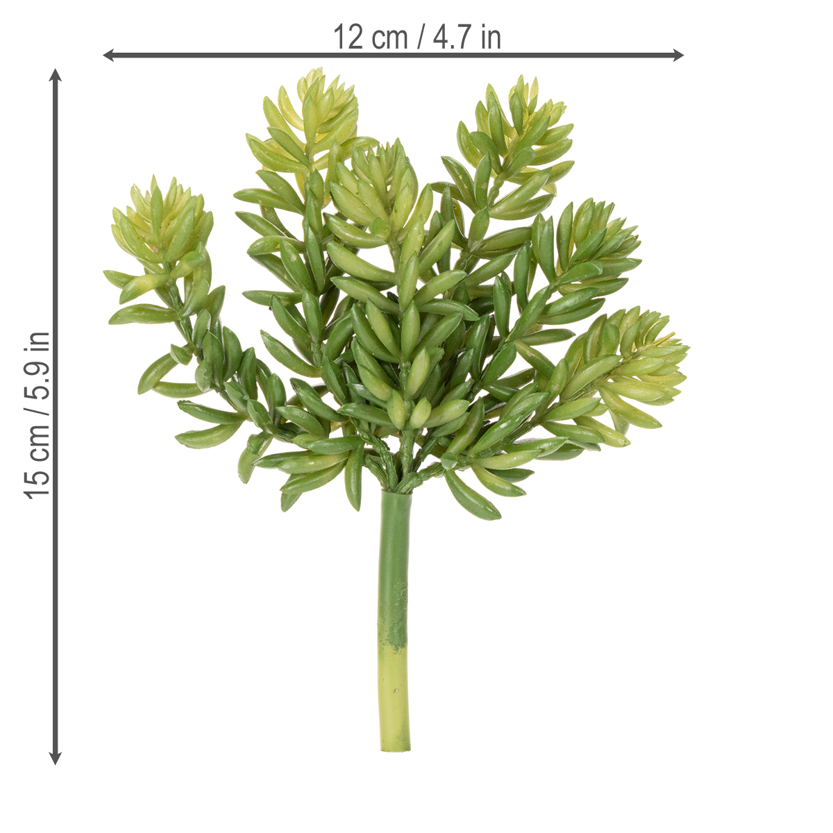 Our artificial succulent impresses not only with its realistic design but also with its versatility. The meticulous detail and rich green color make it a perfect decorative highlight in any room. The thick, sturdy stem ensures the plant fits in any vase or arrangement, while its six-pronged branches offer a particularly natural look. This artificial flower is ideal for those seeking low-maintenance decorative options. At 15 cm tall, it fits perfectly on shelves, sideboards, or in display cases. Combined with other decorative elements such as wooden bowls, candle holders, or minimalist glass vases, it quickly creates a harmonious overall look. Do you prefer a modern or Scandinavian style? This succulent blends in seamlessly and is guaranteed to be an eye-catcher! The succulent also makes a great impression in the office. Spaces such as reception areas, waiting rooms, or conference rooms benefit from its relaxing ambiance and calming green tones. Do you want to beautify your office environment without requiring anyone to invest time in maintenance? These artificial plants offer the perfect solution.