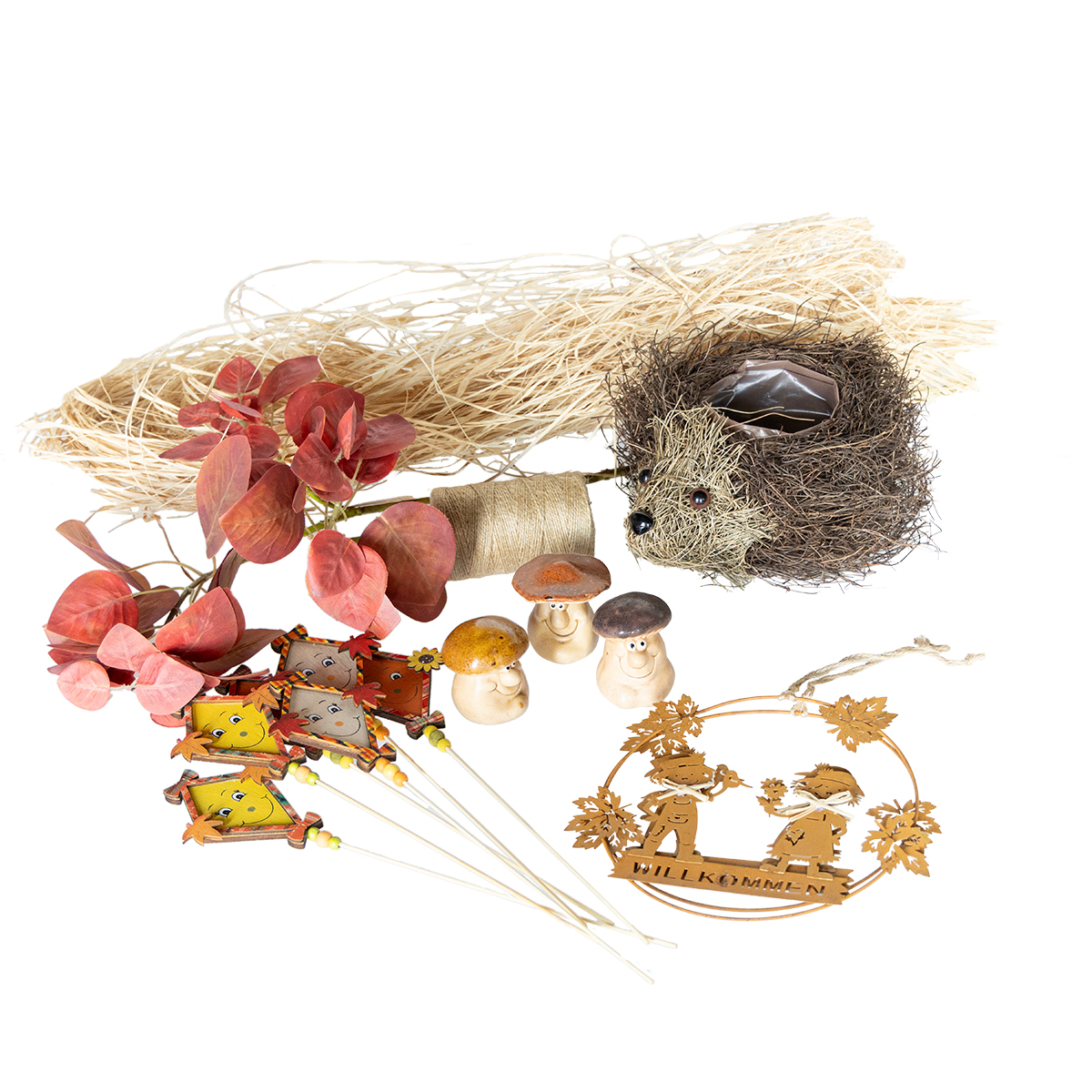 Our autumn decoration set combines everything you need for atmospheric fall decor. This cute hedgehog made of vines will be an eye-catcher in rustic and cozy rooms—perfect for a country-house style. It's complemented by miniature mushrooms in warm brown, beige, and rust-red, as well as playful flower picks, practical jute twine, realistic red autumn leaves as artificial plants, and a rust-colored welcome sign.
