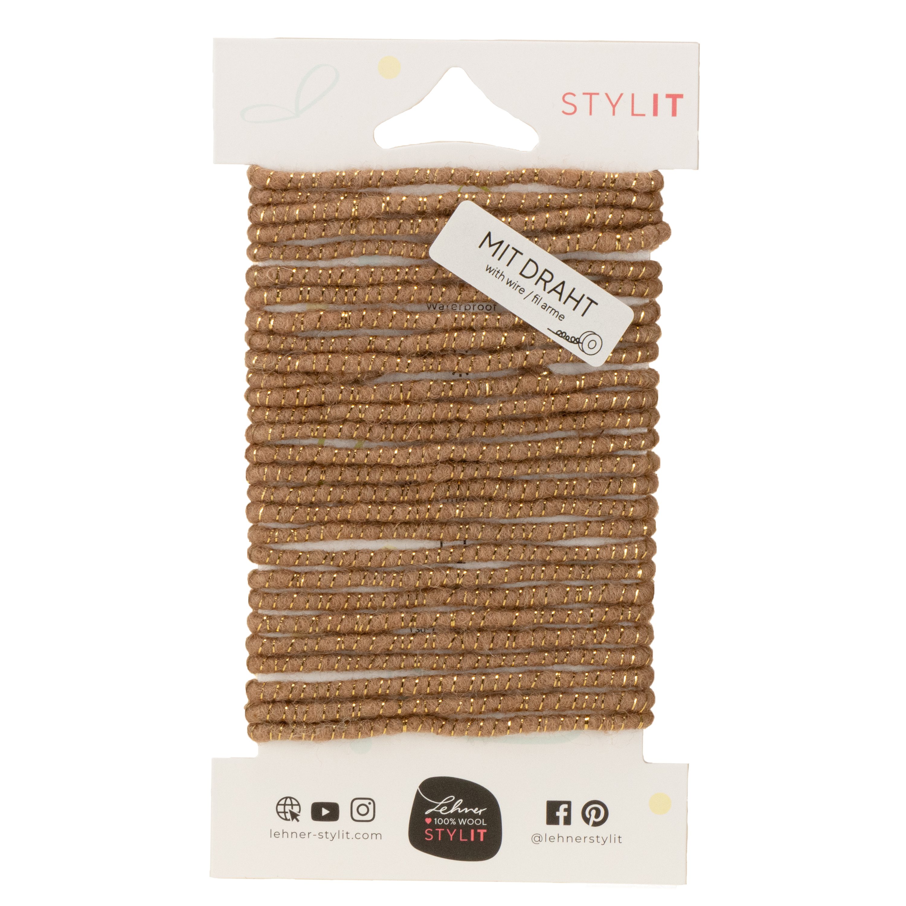 This brown and gold wool cord is a true all-rounder when it comes to decorating, crafting, and creative projects. Made from 100% wool and interwoven with fine, shimmering gold lurex accents, it has a particularly sophisticated look. Perfect for adding a warm yet elegant touch to any project. The integrated wire inside keeps the cord in shape and makes it incredibly easy to bend into all sorts of forms – from delicate wrappings to bolder bows and loops.