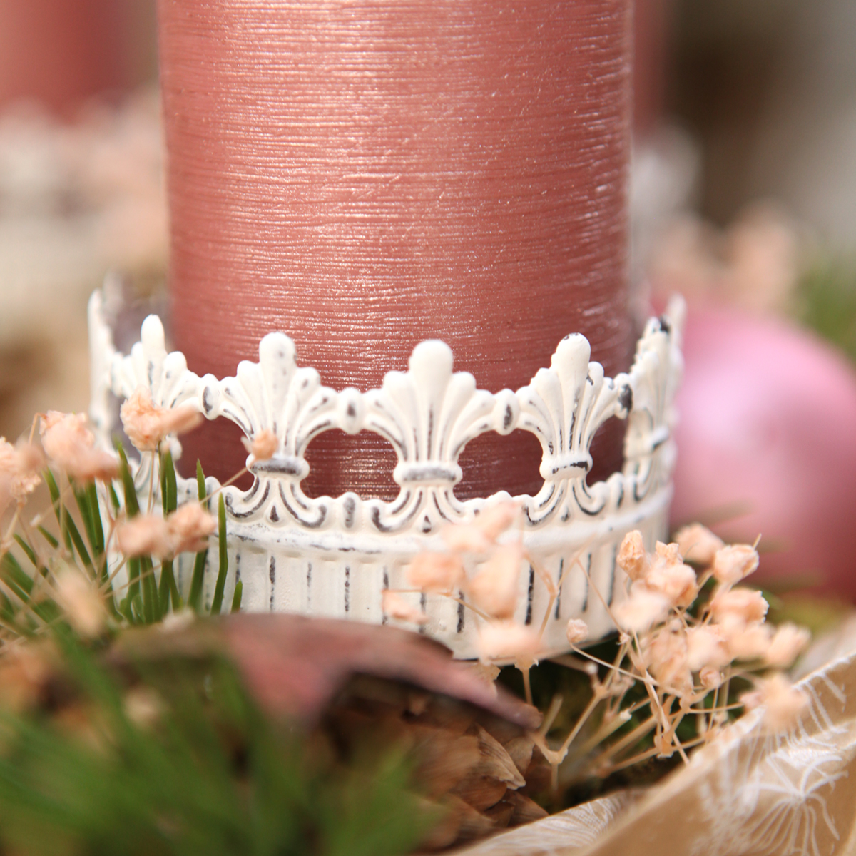 Simply place the candle holder in a floral arrangement featuring pastel-colored flowers and small branches with lace decorations to create a unique and nostalgic piece of jewelry that you can place in your cozy home, for example, on a sideboard or in the center of your dining table. The holder is also a perfect choice for a romantic wedding gift or looks wonderful on its own with a thicker, colorful block candle.