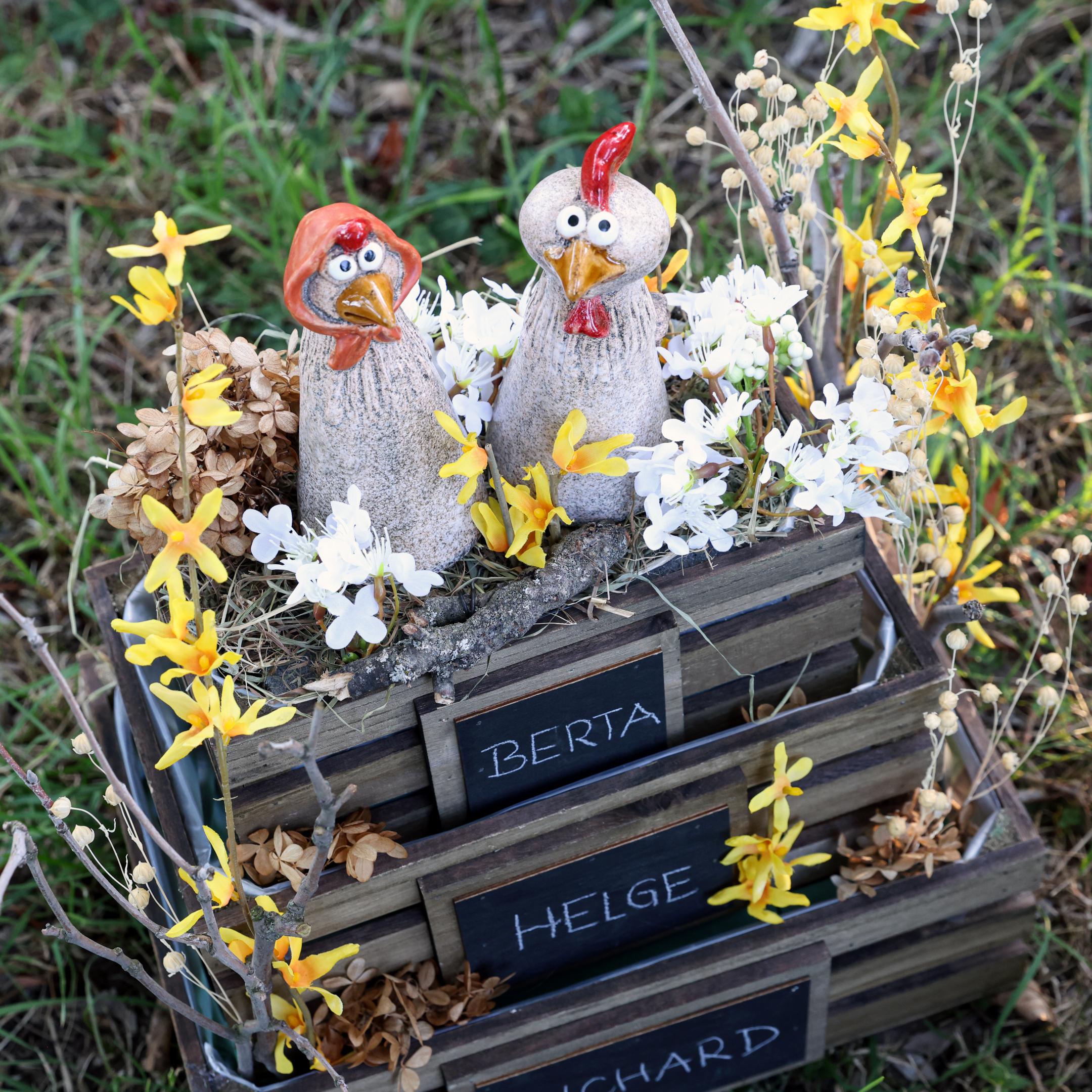 Our ceramic decorative chickens are ideal for different decoration concepts. Place them on your windowsill to spread Easter spirit both inside and out. Combine the set with small colorful eggs or flower arrangements made of artificial flowers from Floristik24 to create a harmonious ensemble. Especially on the Easter table in combination with our ceramic rabbit from the same range, they bring happiness and life into the living room. Or surprise your guests with this charming decoration on the terrace during an Easter brunch. For a harmonious overall impression, you can find other items such as vases in natural tones or tablecloths in a rustic style at Floristik24 that underline the country house look.