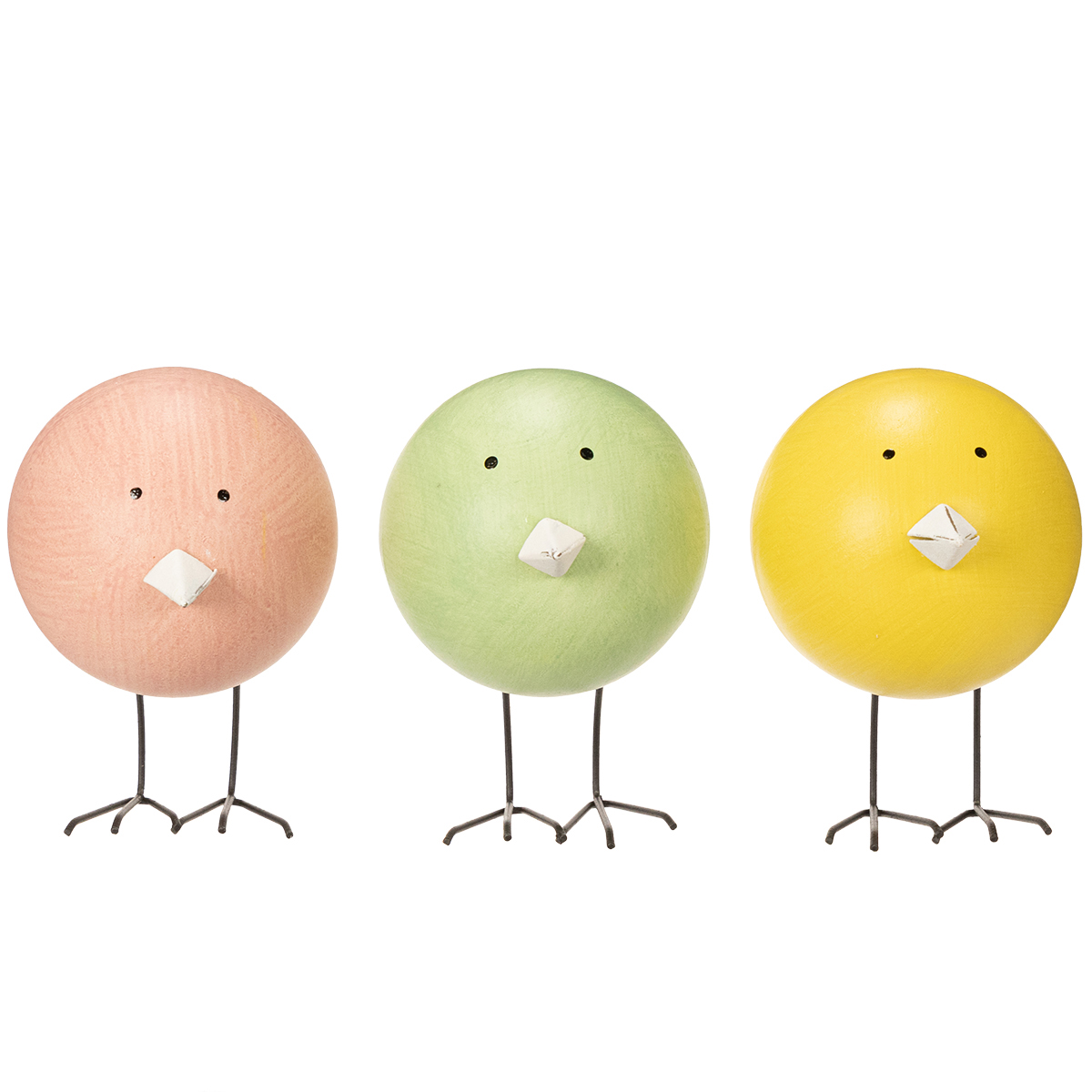 Looking for a clever way to add a playful and cheerful touch to your home? Our round chick decorative figurines will instantly brighten up any room. Whether as charming spring decorations on the dining table, a colorful addition to a festive table setting, or a sweet eye-catcher in a child's room – these three little figures in yellow, pink, and green are guaranteed to bring a smile to everyone's face. The combination of wood for the bodies and metal for the beaks and feet gives the chicks a sturdy base and a modern design twist.