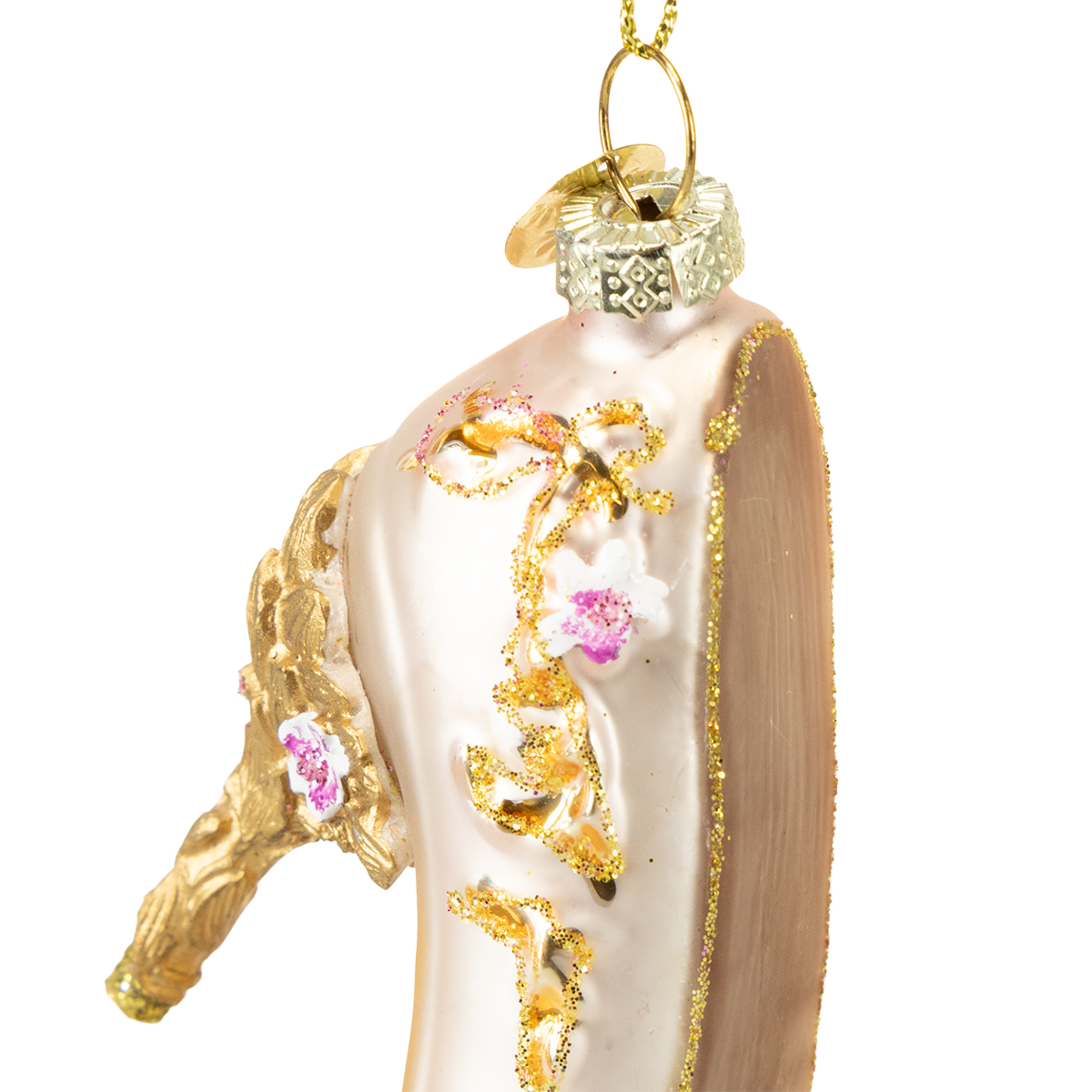 Every Christmas tree decoration has a special story – and these beautiful glass shoes are no exception! Their fine details, such as artfully sculpted golden floral decorations, make them truly special. Their hanging loop makes them easy to attach to branches, garlands, or even decorative twigs in a vase. The delicate rose-colored surface has a pleasant satin finish, which, combined with the gold, creates a festive and harmonious color scheme. The plastic heels give the shoes additional stability without detracting from the elegant overall impression.