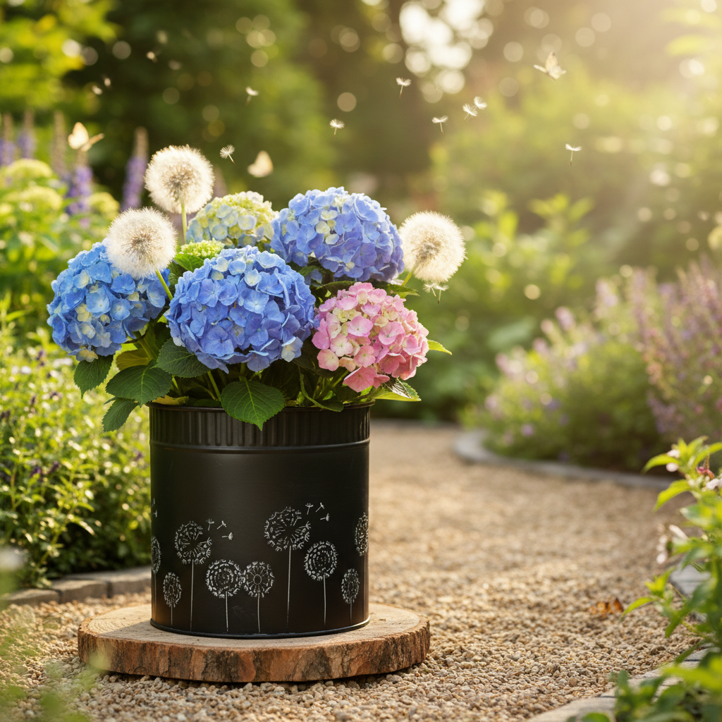 The planter with dandelions gives flowers and arrangements in summer decoration an original look. But the black flowerpot can also provide a special setting for a small green plant.