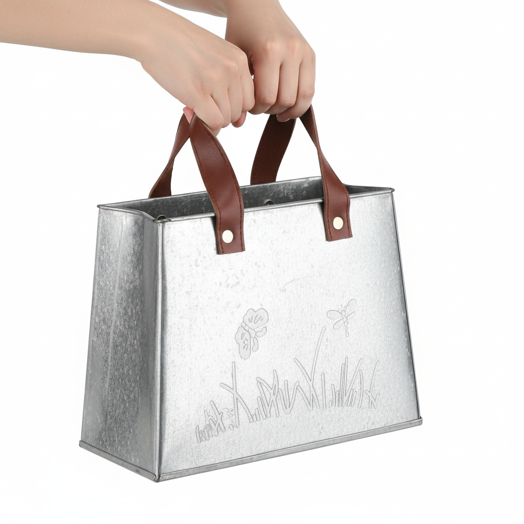 Our silver-colored decorative metal bags combine functionality and design in an extraordinary way. These planters are ideal for decorators, creative minds and all those who want to add a touch of elegance to their home. With a white motif of butterflies and grasses on both sides and the brown faux leather handles, you get a product that is suitable both as a plant pot and as a decorative element for the balcony or table. This decorative plant bag highlights the rustic charm and goes wonderfully with other vintage decorations. Give your home a personal touch with these extraordinary metal plant pots, which impress with their simple, timeless elegance.