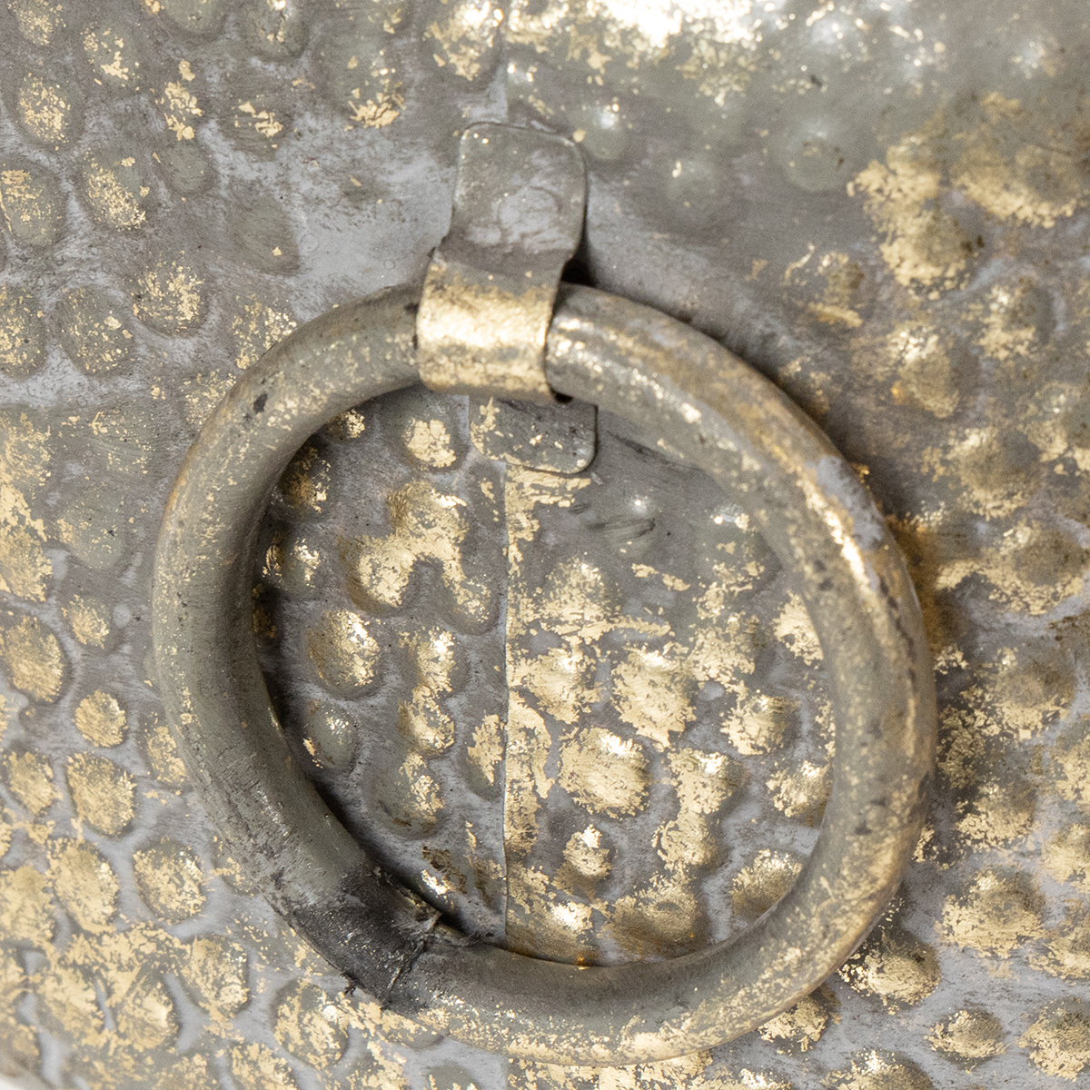 The decorative bowl made of metal in an antique look gives plants and arrangements an oriental flair, but is also suitable as a room decoration. The round cachepot looks really old thanks to the vintage finish, the hammered dot pattern and the round, movable handles. The gold color makes the planter look like a noble brass decoration. The inside of the metal shell is gray.