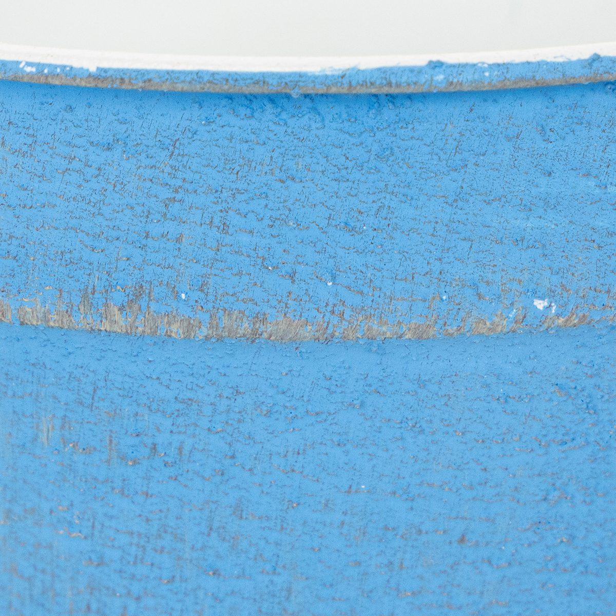 The decorative bowl is made of thin metal and is therefore very light. Inside the decorative pot is white, outside the metal decoration shines in the most beautiful sky blue. Due to the roughened surface and gray accents, the planter looks authentically old. A bead and two small handles allow the decorative bowl to be wired or decorated with jute ribbon if required.