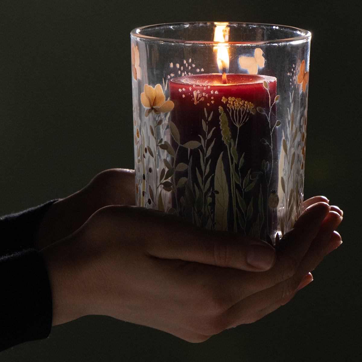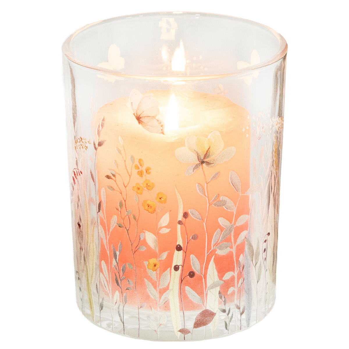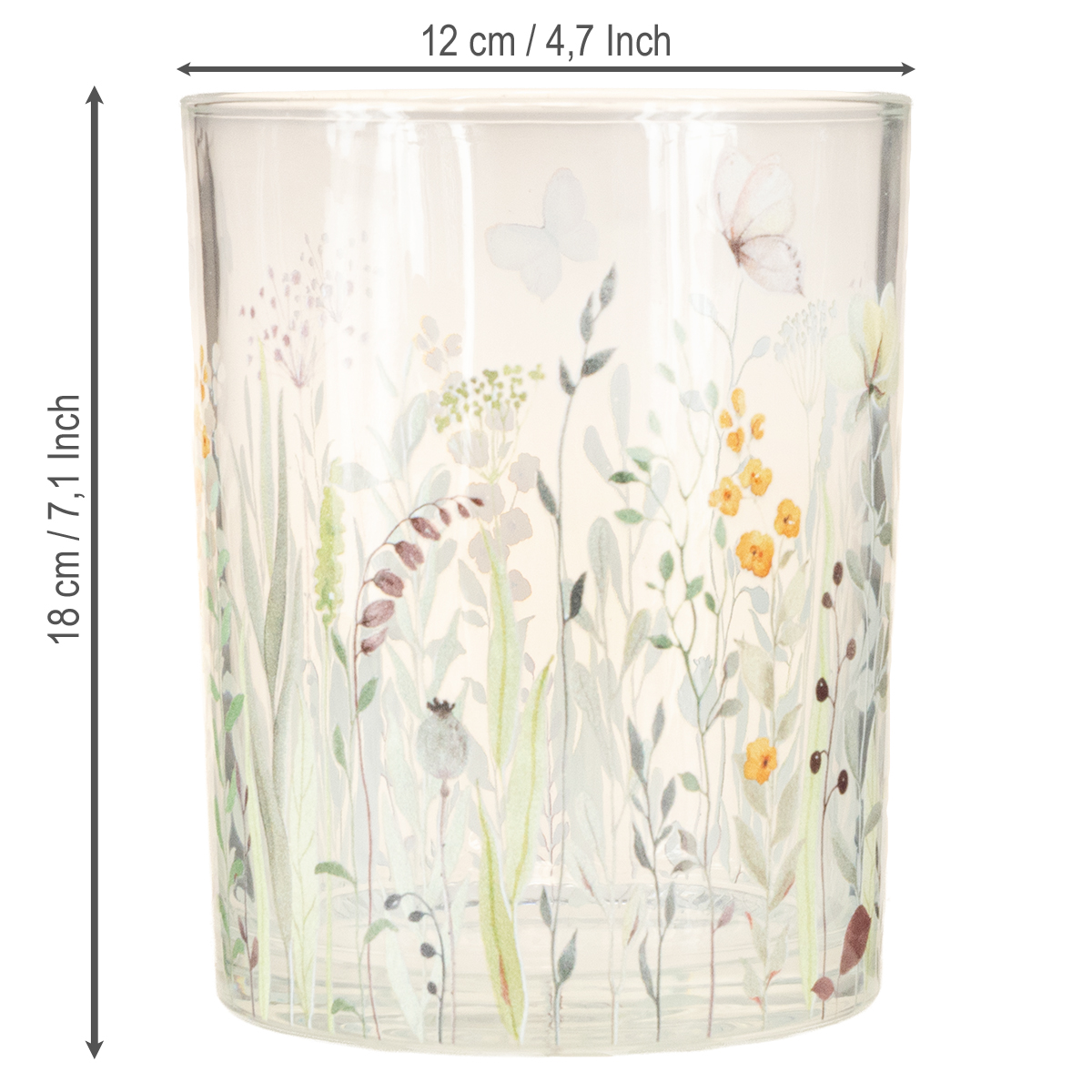Want to add a fresh, summery touch to your home? This decorative candle holder with its enchanting butterfly motif will transport you to a delicate flower meadow. It's like holding the lightness of a spring morning in your hand. Whether on the dining table, the windowsill, or the patio – this elegant glass candle holder not only provides pleasant light but also an extra dose of style. The combination of the delicate floral pattern and soft butterflies lends any room a natural, soothing atmosphere. It also complements a variety of interior design styles. And the best part? At 18 cm tall and 12 cm in diameter, it's both a striking statement piece and wonderfully understated. Make yourself comfortable, enjoy the soft light, and leave the everyday world outside for a moment.
