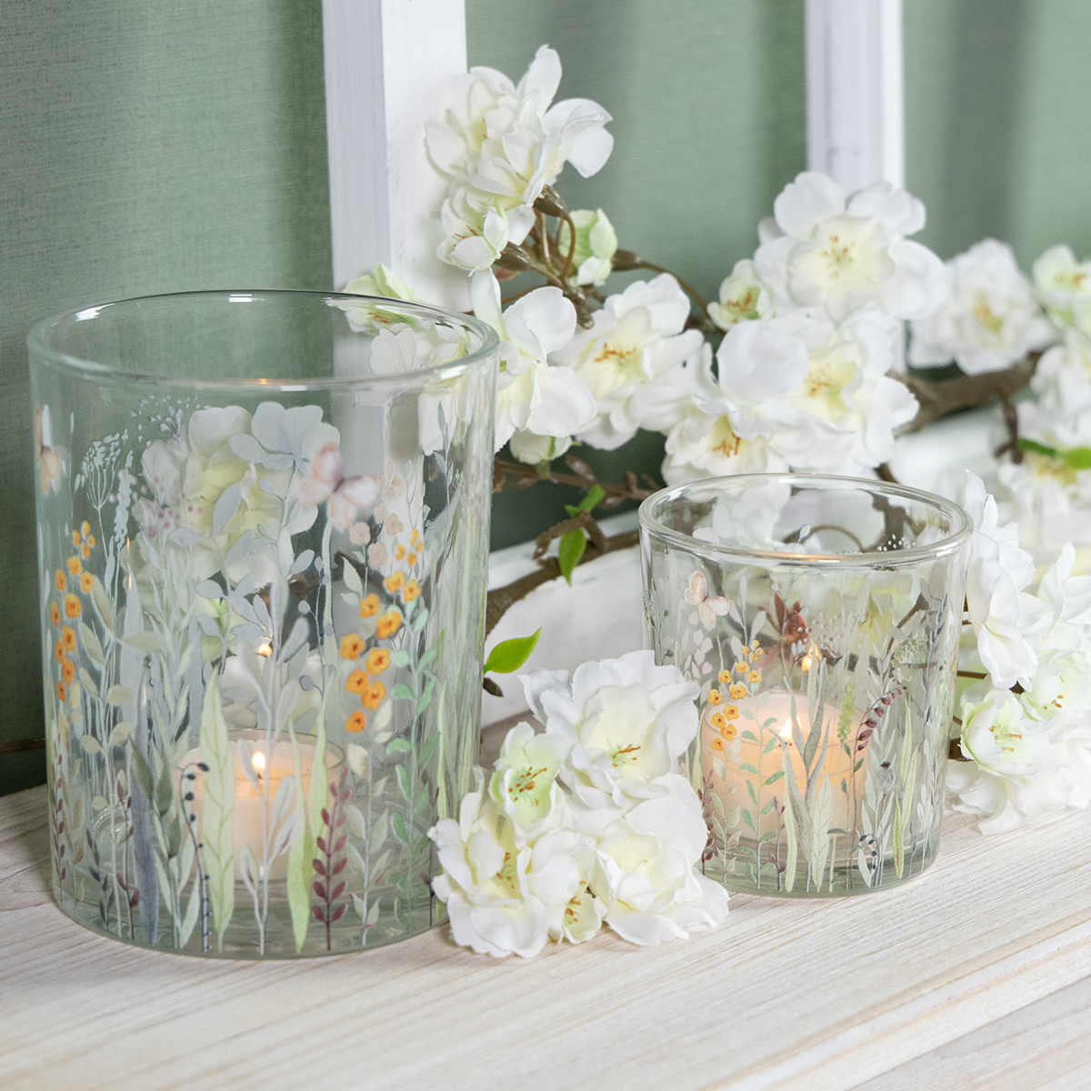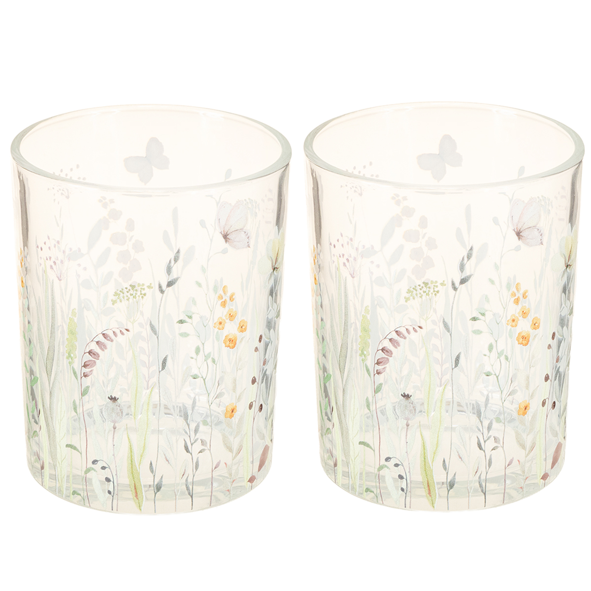 Decorative glass lantern with butterfly meadow motif for stylish home accents, 18cm, 2 pieces