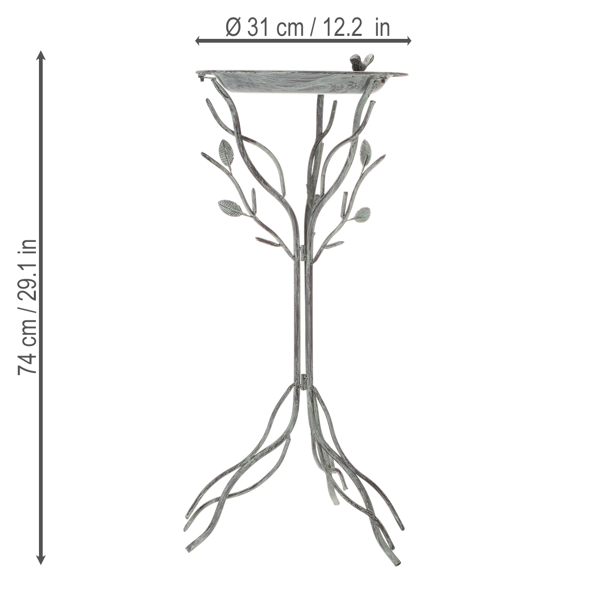 This birdbath impresses not only with its functionality but also with its delicate design. The design, reminiscent of branching limbs, blends harmoniously into any garden setting, be it modern, rustic, or romantic country style. Standing 74 cm tall, the birdbath rests securely on its artfully crafted metal base. Its gray color underscores its timeless elegance and allows for versatile combinations – whether with flowering plants in vibrant colors or subtle tones. The rust-resistant material ensures that you will enjoy this beautiful piece for many years to come.