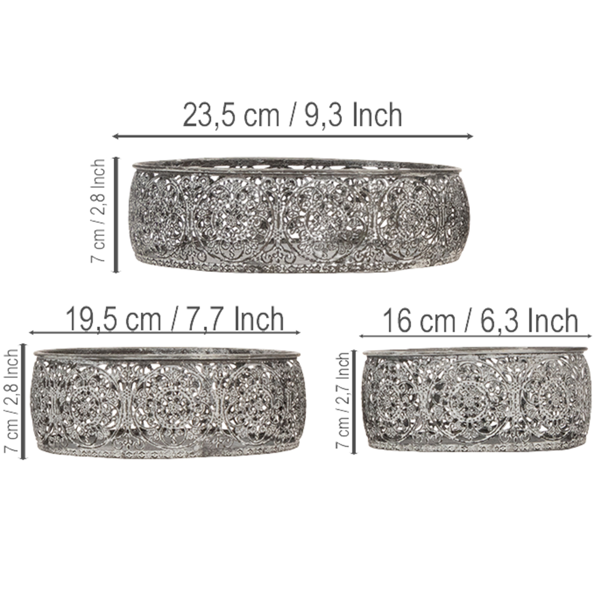 Decorative metal bowl, grey and white pattern, Ø16/19.5/23.5cm, set of 3