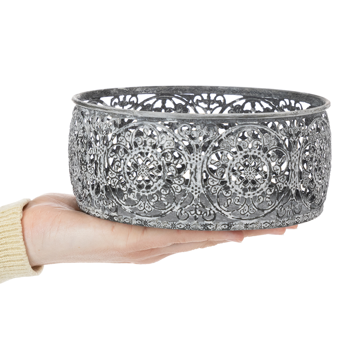 The floral patterns and the timeless silver gray make the white washed decorative bowl a wonderful vintage decoration.