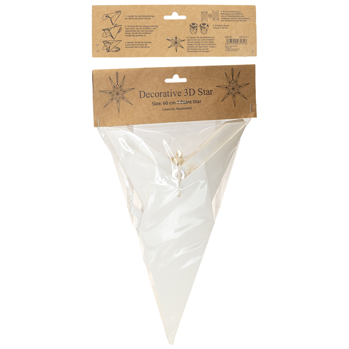 This paper star is not only a real eye-catcher, but also impresses with its high-quality workmanship. The cream-colored paper exudes a pleasant simplicity that is simultaneously elegant. With a diameter of 60 cm, the star is ideal for decorating larger windows, but also entire rooms – whether as a living room decoration above the table, as a window decoration with atmospheric lighting, or as a highlight in entryways. The integrated cotton hanger with cord stopper makes hanging easy and ensures a secure hold.
