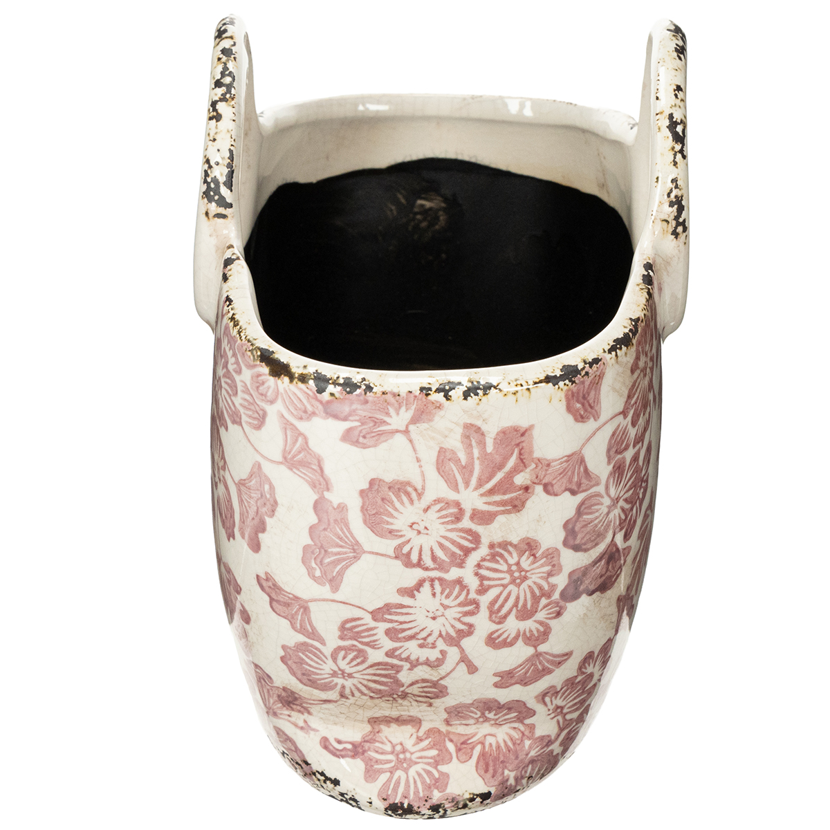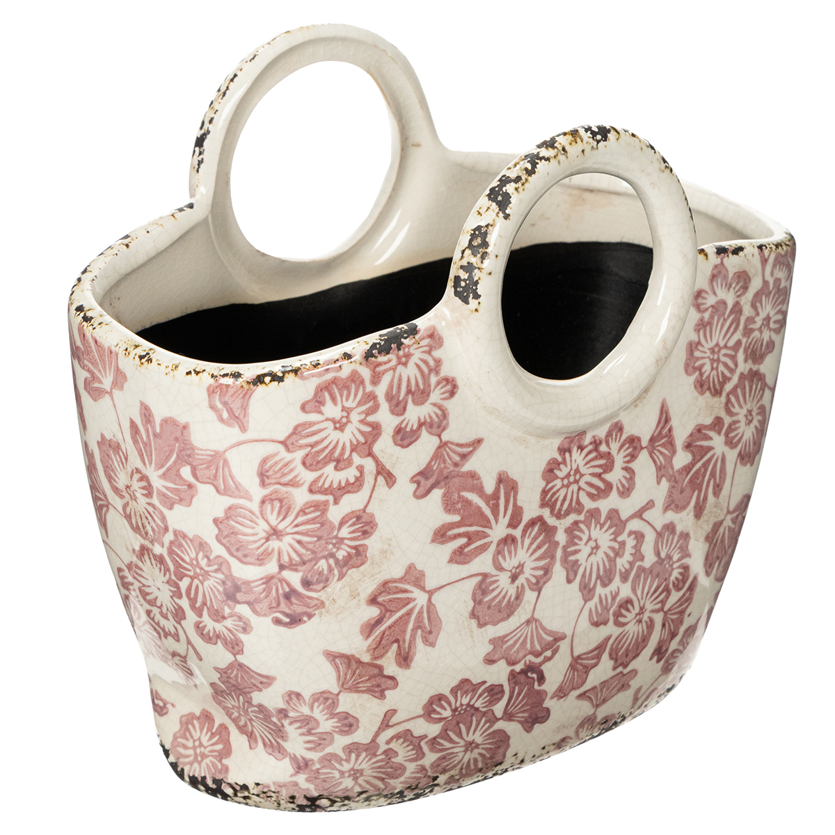This floral ceramic flower pot impresses with its harmonious blend of functionality and design. Its bag-like shape with two sturdy handles not only creates a striking look but also makes it easy to carry. Whether indoors or outdoors, this planter looks great anywhere. Measuring 21 cm long, 13 cm wide, and 18 cm high, it offers ample space for small green plants or lovingly arranged bouquets. Its robust construction from high-quality ceramic ensures stability, while the subtle interplay of white and red gives the pot a romantic yet fresh appeal.