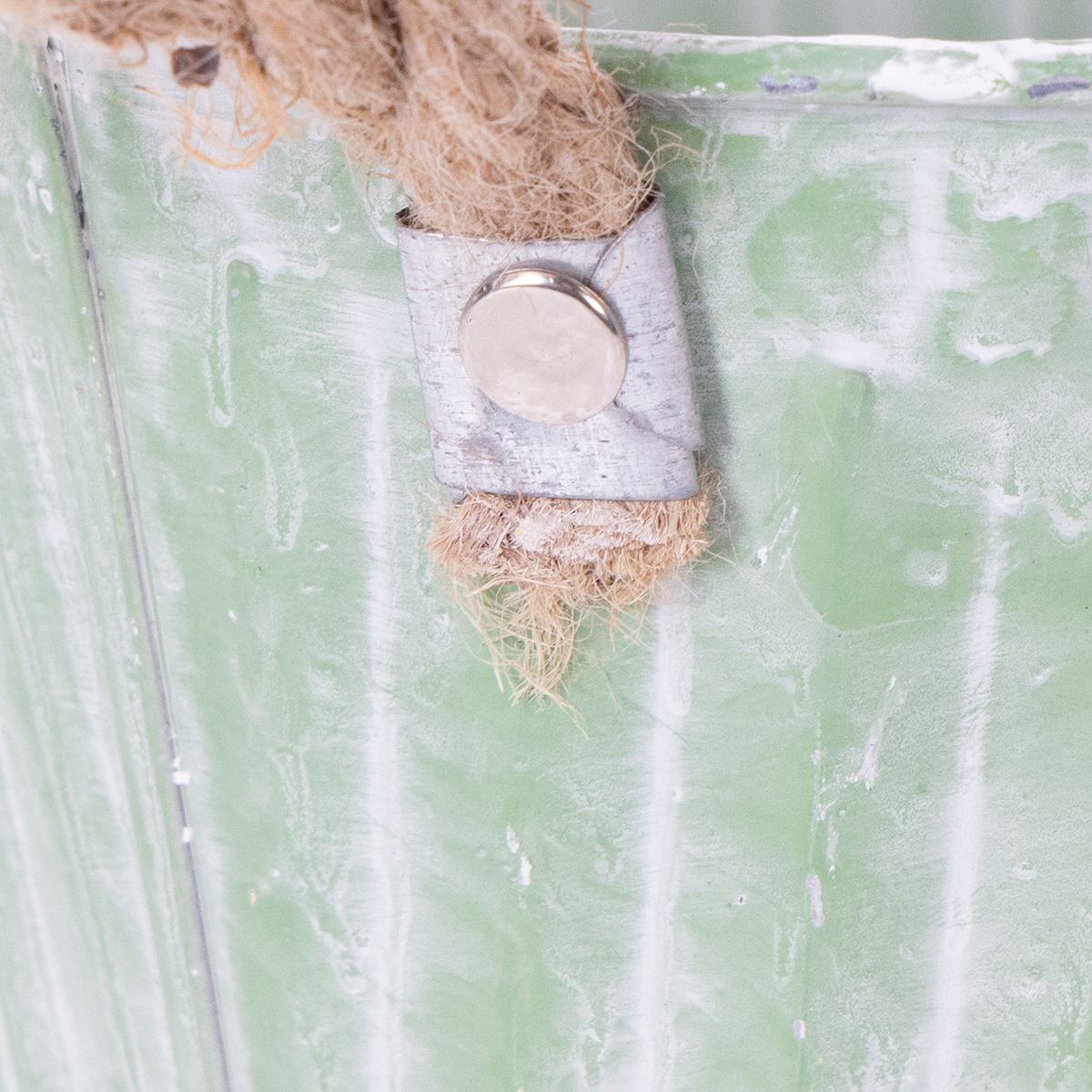 The planter is equipped with jute cord handles and has been whitewashed. The planting bowl is also decorated all around with an embossed, uniform pattern of vertical stripes. The whitewashing of the planters creates a beautiful contrast to the pastel pink, green, and yellow base tones of the metal containers, making the pattern of the metal decoration stand out even more!