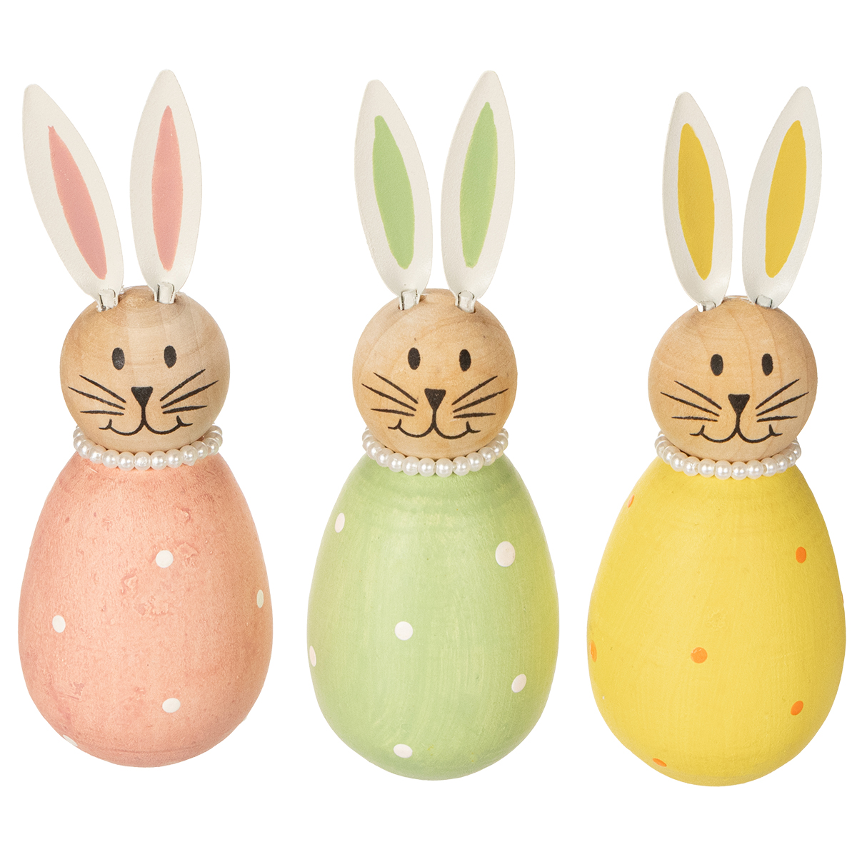 What could be better than welcoming spring with charming decorations? These decorative egg-shaped bunny figurines will not only bring a smile to everyone's face but also fill your living space with a cheerful springtime atmosphere. Whether on the windowsill, the Easter table, or a shelf, these lovingly crafted decorative figures are sure to catch everyone's eye. With their delicate pastel shades of pink, yellow, and green, and hand-painted details, they lend your home a warm and inviting touch. The fine metal ears, the subtle dots on the egg bodies, and the dainty pearl necklaces around their necks—these little details make the figurines truly special. Looking to add a touch of springtime lightness to your rooms or enhance your Easter decorations? Then these colorful wooden bunnies are the perfect choice!