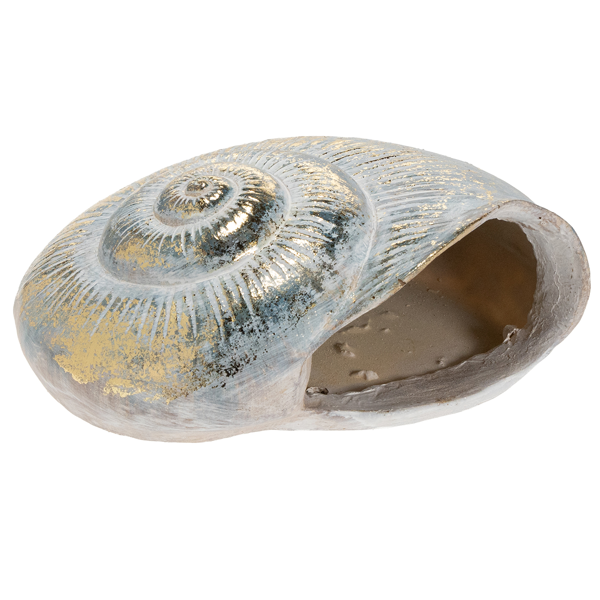 Are you looking for a special highlight for your wall or table decoration? This snail-shaped decorative container is guaranteed to catch everyone's eye. With its unique look, gray color, and subtle golden shimmer, it brings a real beach house feel to your home. Whether in the living room with nautical motifs, on the patio for a summery ambiance, or even in the bathroom for a cohesive seaside theme – this home accessory always fits! It's also practical and thoughtfully designed. The back is flat and features a hanging hole, allowing you to place the snail shape flexibly or mount it on the wall. So why wait any longer? Bring a touch of maritime charm into your home with this natural wall decoration.