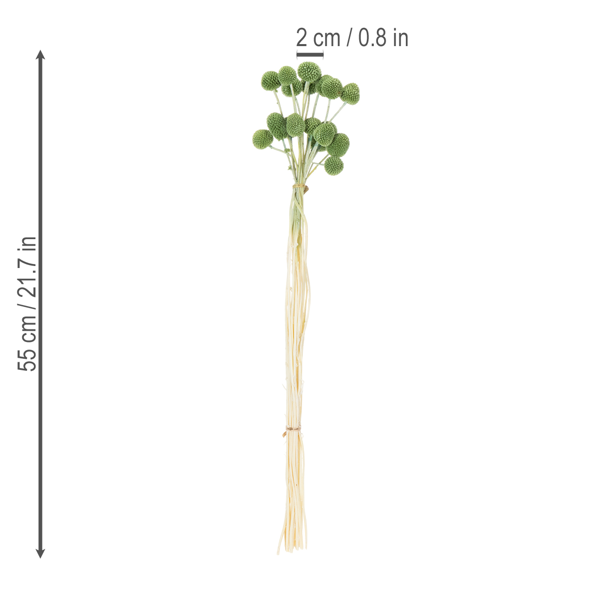Bring a touch of natural charm and autumn to your home! These green dried Craspedia flowers, also known as drumstick flowers, are the perfect finishing touch for stylish table decorations, autumnal bouquets, or creative craft projects. Standing 55 centimeters tall and in a quantity of 20, these long-lasting dried flowers offer countless design possibilities. They are ideal for indoor or sheltered outdoor spaces and impress with their minimalist elegance and versatility. Whether used as floral wedding decorations, in an elegant vase, or as part of a unique autumn wreath, these Craspedia balls are an invitation to dream and decorate.