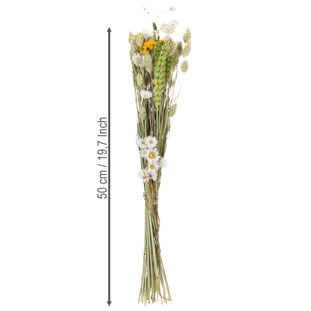 This impressive 50-centimeter-tall dried flower arrangement offers numerous design possibilities. Whether used as a stylish table centerpiece or as a decorative element in a dried flower vase, this arrangement is sure to catch everyone's eye. The carefully coordinated combination of grains, strawflowers, grasses, and other natural materials creates a harmonious look. It's ideal for adding a touch of understated elegance to your living room, hallway, or bedroom.