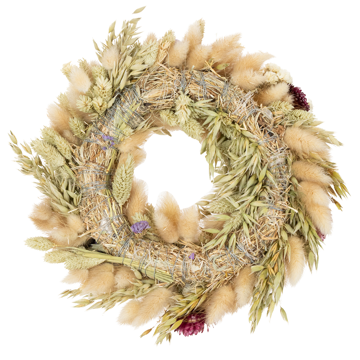 With a diameter of 25 centimeters, this dried flower wreath blends harmoniously into any setting without being obtrusive. The lovingly selected blossoms and natural materials – from velvety grasses to delicate flowers in beige, lilac, burgundy, and cream – give it a unique charm. From romantic to modern, this handcrafted dried flower wreath complements various styles and always exudes a natural elegance.