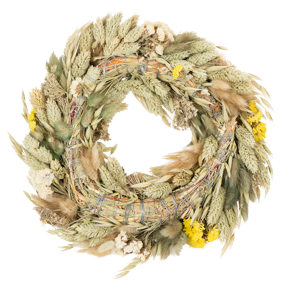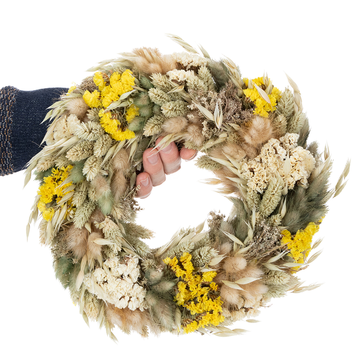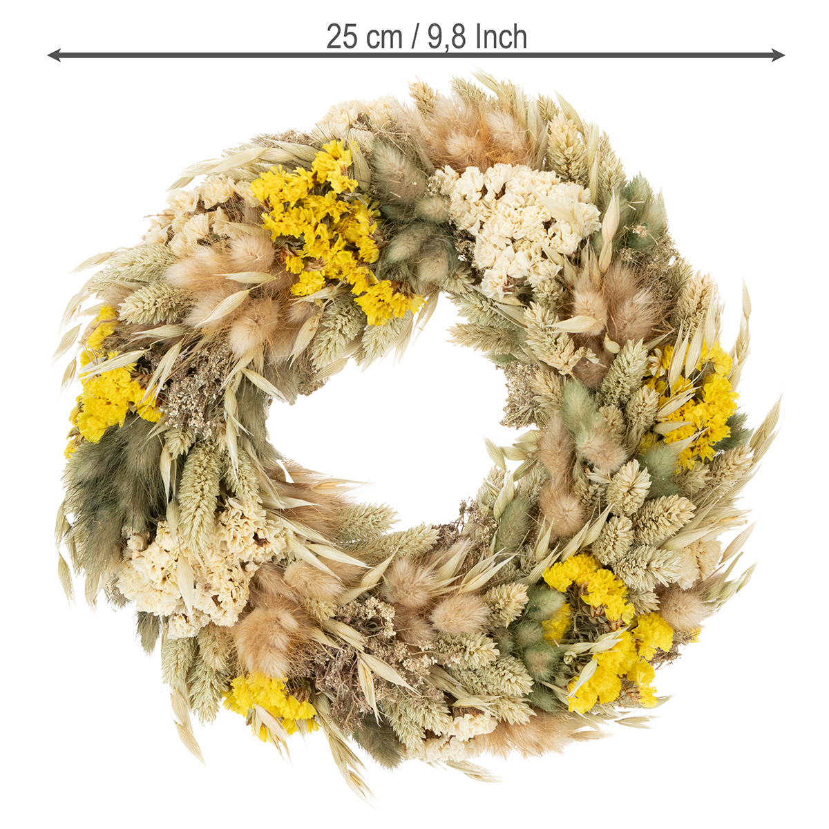 Thanks to the natural materials, the dried flower wreath exudes a lightness that, combined with flowers in beige and yellow tones, creates a harmonious overall look. It is easy to care for, durable, and retains its beautiful appearance throughout the seasons. To clean it, simply dust the wreath occasionally with a soft dusting brush.
