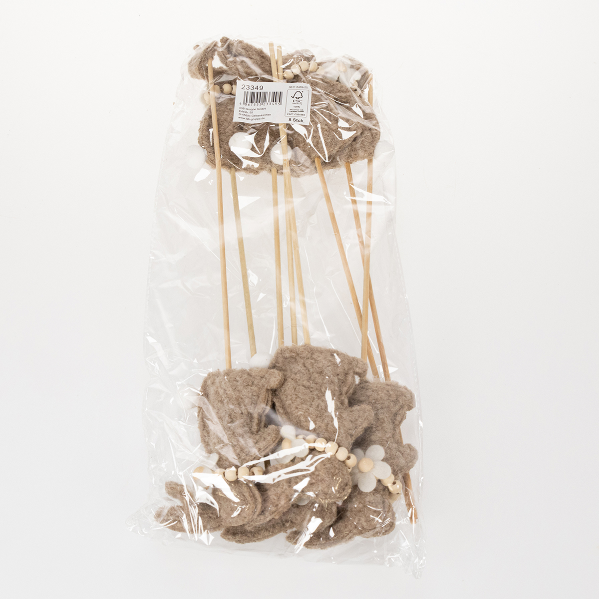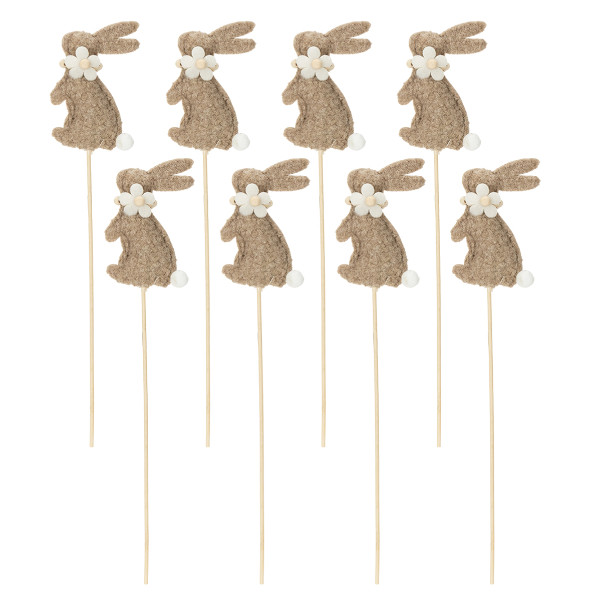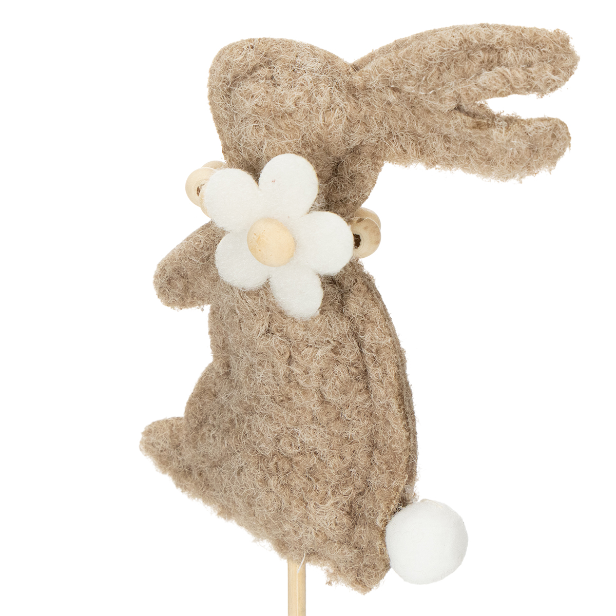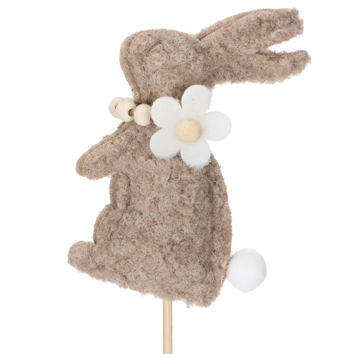 This Easter bunny decoration is a true highlight for creative decorating enthusiasts. The figures are made of high-quality felt in a warm brown tone that exudes naturalness and coziness. The charming details, such as the delicate flower and the small fluffy tail, give the bunnies a special appeal. The sturdy stick makes it easy to arrange the bunnies in vases, planted pots, or floral arrangements. Those who prefer minimalist or Scandinavian designs will love the understated yet expressive style of these figures.