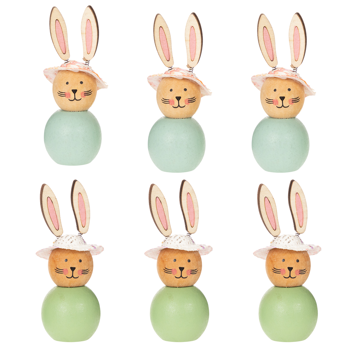 These wooden figurines impress with their natural charm and cheerful appeal: clear wood combined with subtle shades of green and mint meets a playful design. The pink hats, in particular, lend the figurines a stylish vintage touch. Each rabbit is approximately 9 cm tall and brings a hint of spring into your home. The ears on metal springs are not only visually striking but also add a lively detail that is sure to catch the eye.