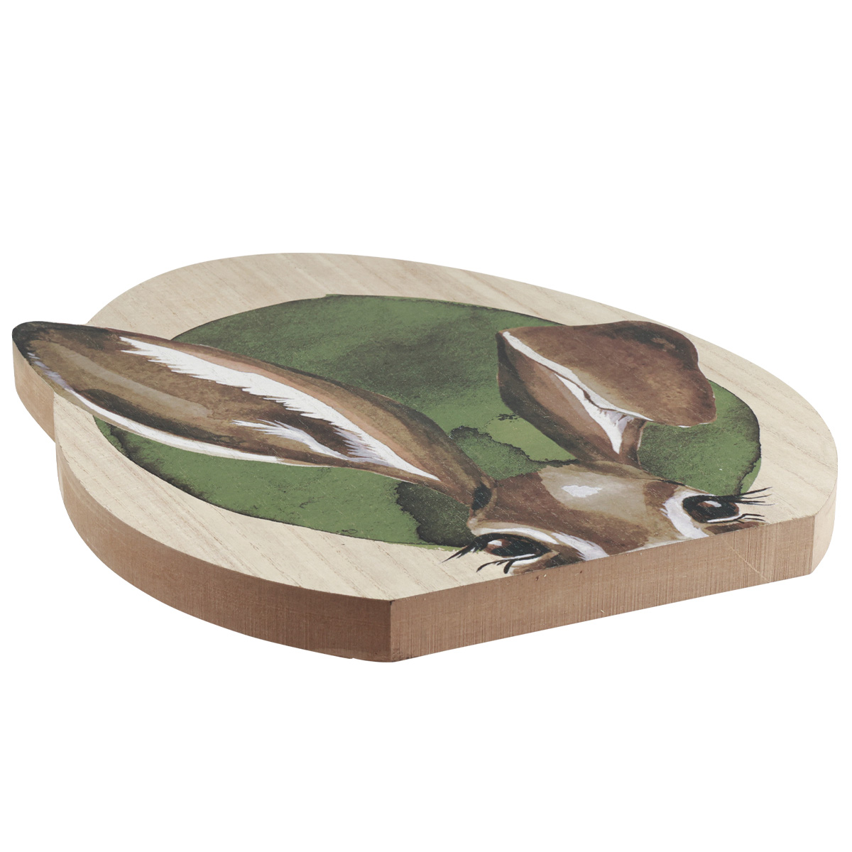 With one ear folded in and the other pointed, the painted rabbit decoration is visible. Long eyelashes draw attention to the curious-looking eyes, which are also marked by white edges.