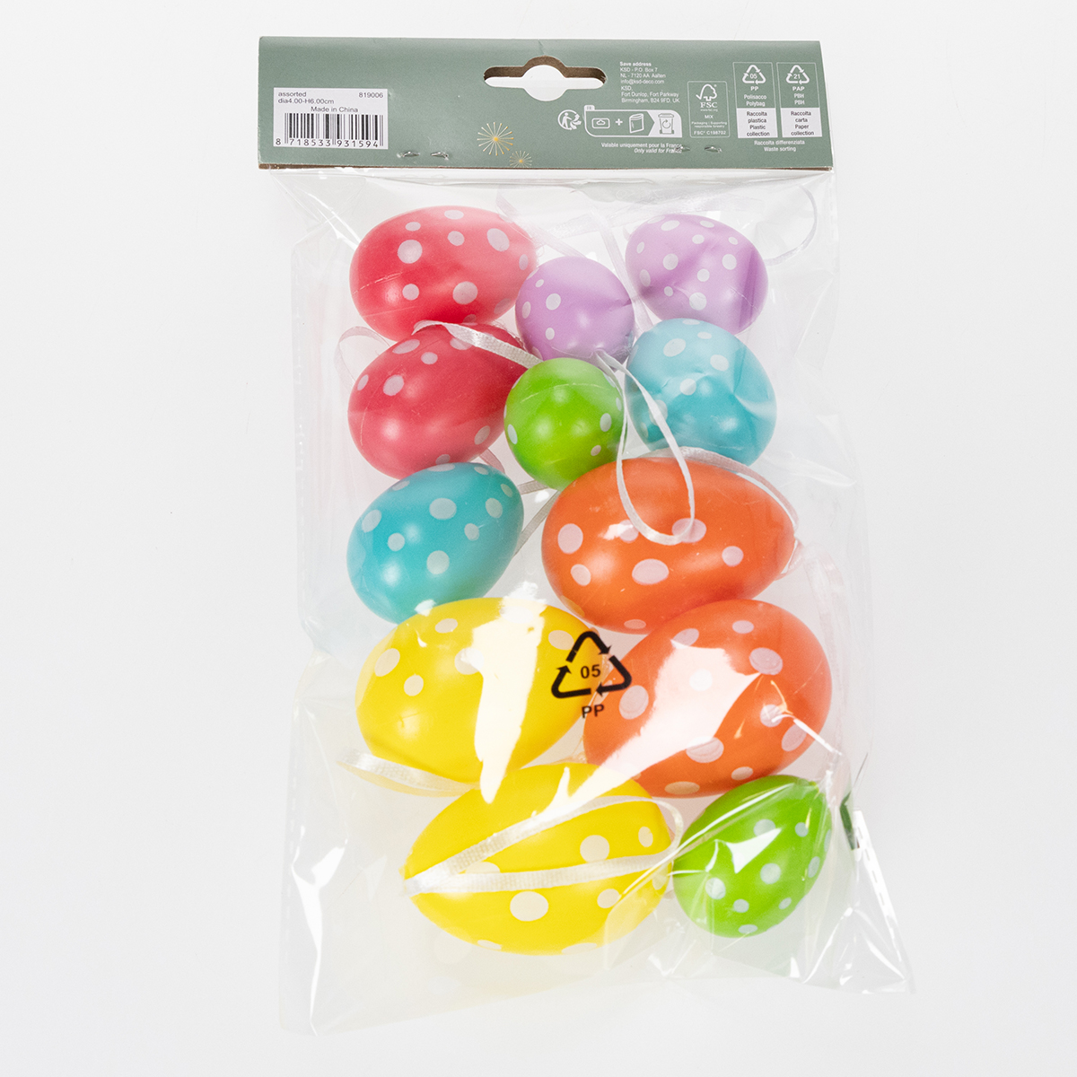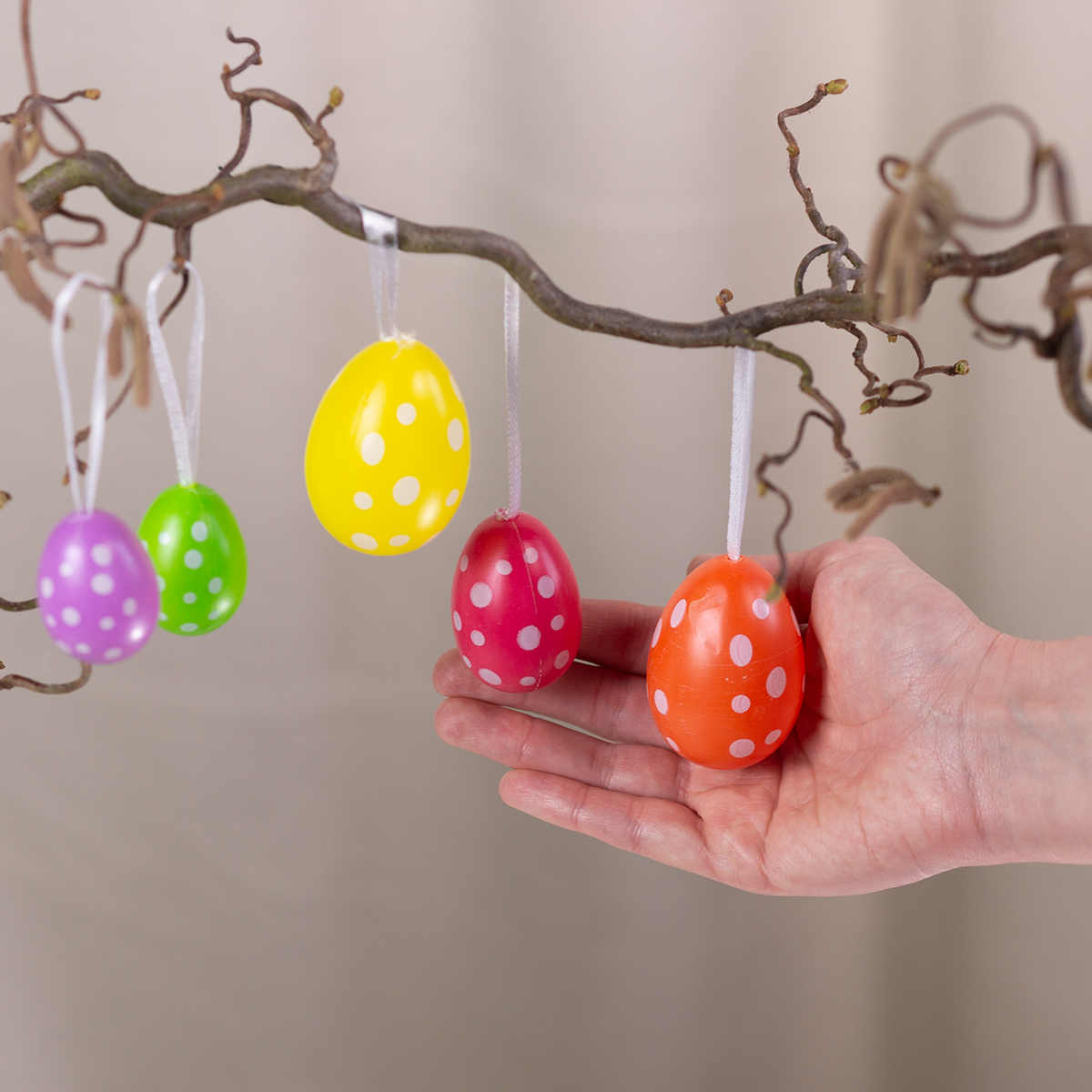These colorful hanging Easter eggs are the perfect accessory for your Easter decorations. The set includes 12 eggs made of durable plastic, making them easy for children to hang. The colors yellow, blue, green, orange, pink, and purple, along with white polka dots, create a vibrant and playful look. The large egg is approximately 6 cm tall – an ideal size for hanging on branches, in floral arrangements, or on the Easter tree.