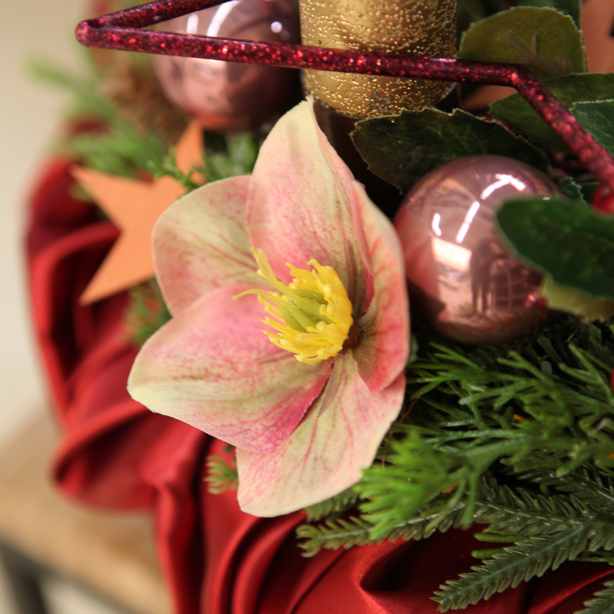 The decorative pink bouquet measures 35 cm and consists of several open flowers and buds. The dark green, shiny leaves form a perfect contrast to the soft pink tones of the Christmas roses. The silk-like petals provide a delicate texture and make the bouquet an attractive addition to any interior design.