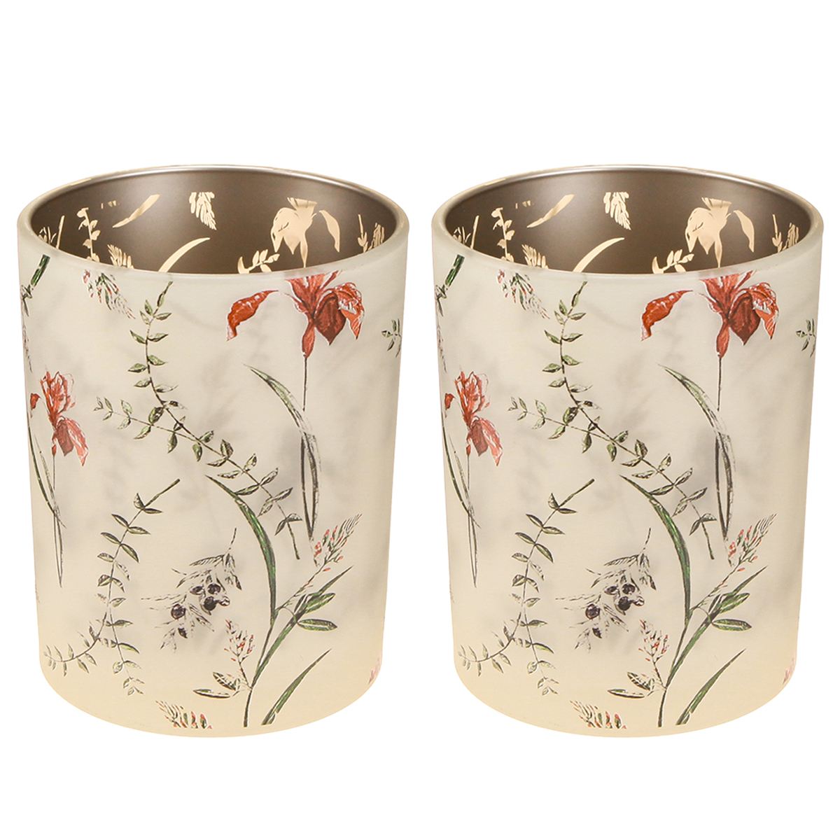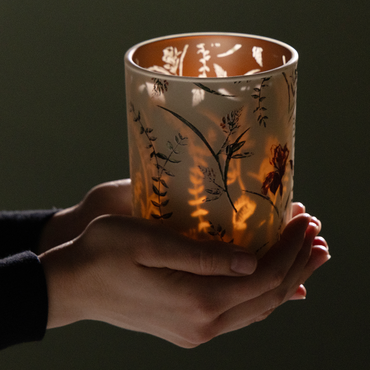 This elegant floral-design candle holder is more than just a simple piece – it's a real eye-catcher! The delicate plant pattern in beige tones is reminiscent of soft watercolor paintings, giving the candle holder a natural yet sophisticated character. The metallic-coated inner rim reflects the candlelight in a way that creates a captivating ambiance. Simply magical for cozy evenings in the living room or on the patio!