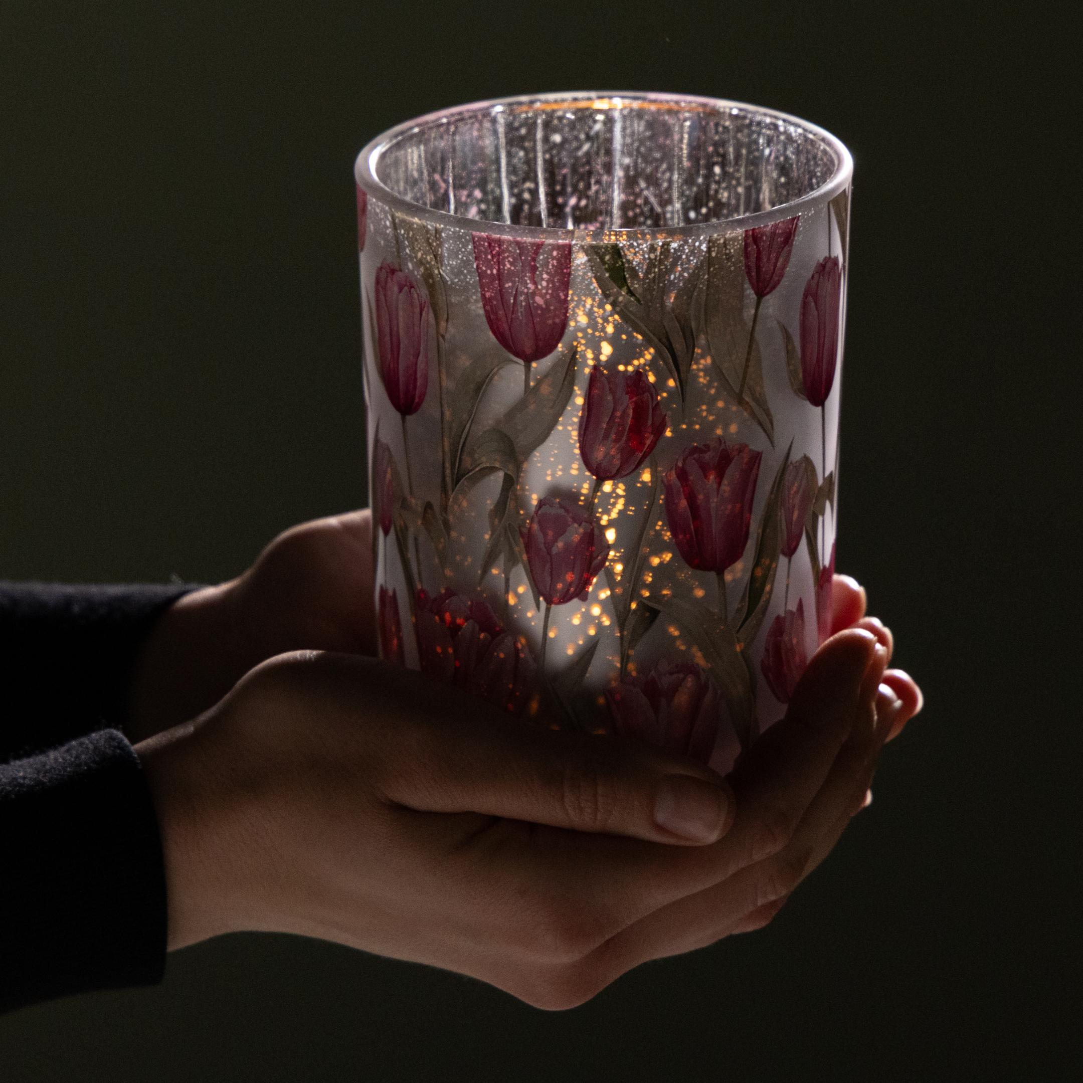 What could be better than bringing spring into your home with a charming decoration? This elegant tulip-themed lantern does just that: it creates a warm, harmonious atmosphere that invites you to linger. The lovingly depicted pink and white tulips on high-quality glass instantly conjure a touch of springtime lightness in any room. And when a candle is lit inside, the mirrored, bright surface reveals its enchanting interplay of light and shadow. Whether on the dining table, the windowsill, or as a highlight during a romantic dinner – this lantern is a true gem. Are you already feeling the spring vibes? Perhaps you're planning a garden party, looking for stylish Easter decorations, or simply want to add some seasonal touches to your living room. Then this exquisite accessory will exceed your expectations. Go ahead, and welcome spring with a touch of elegance and tulip charm!