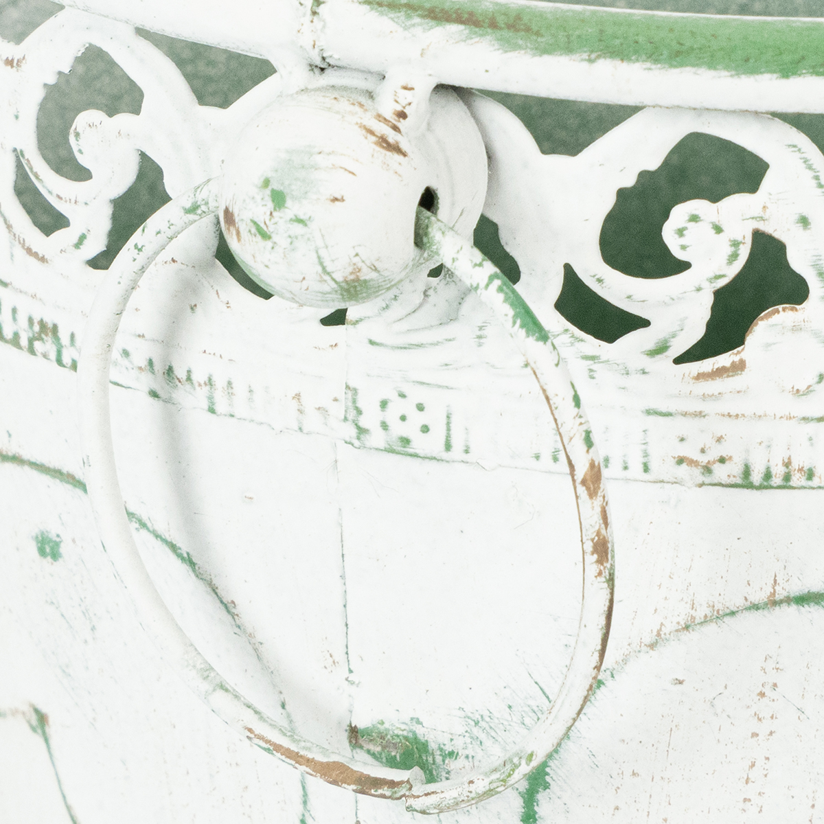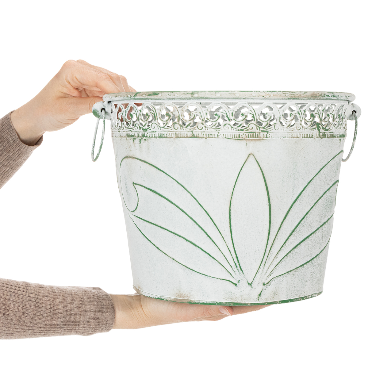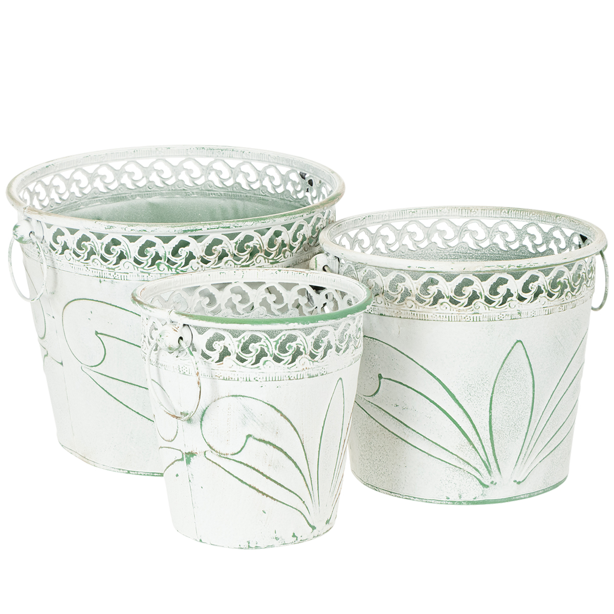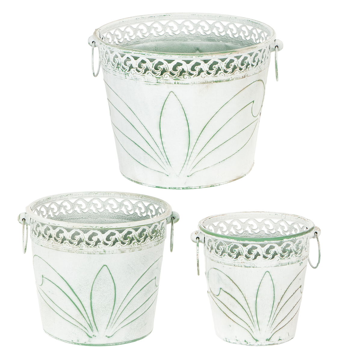 Embossed metal planter with handles, white and green, shabby chic style, H22/19.5/17.5cm, Ø25.5/20.5/15.5cm, set of 3