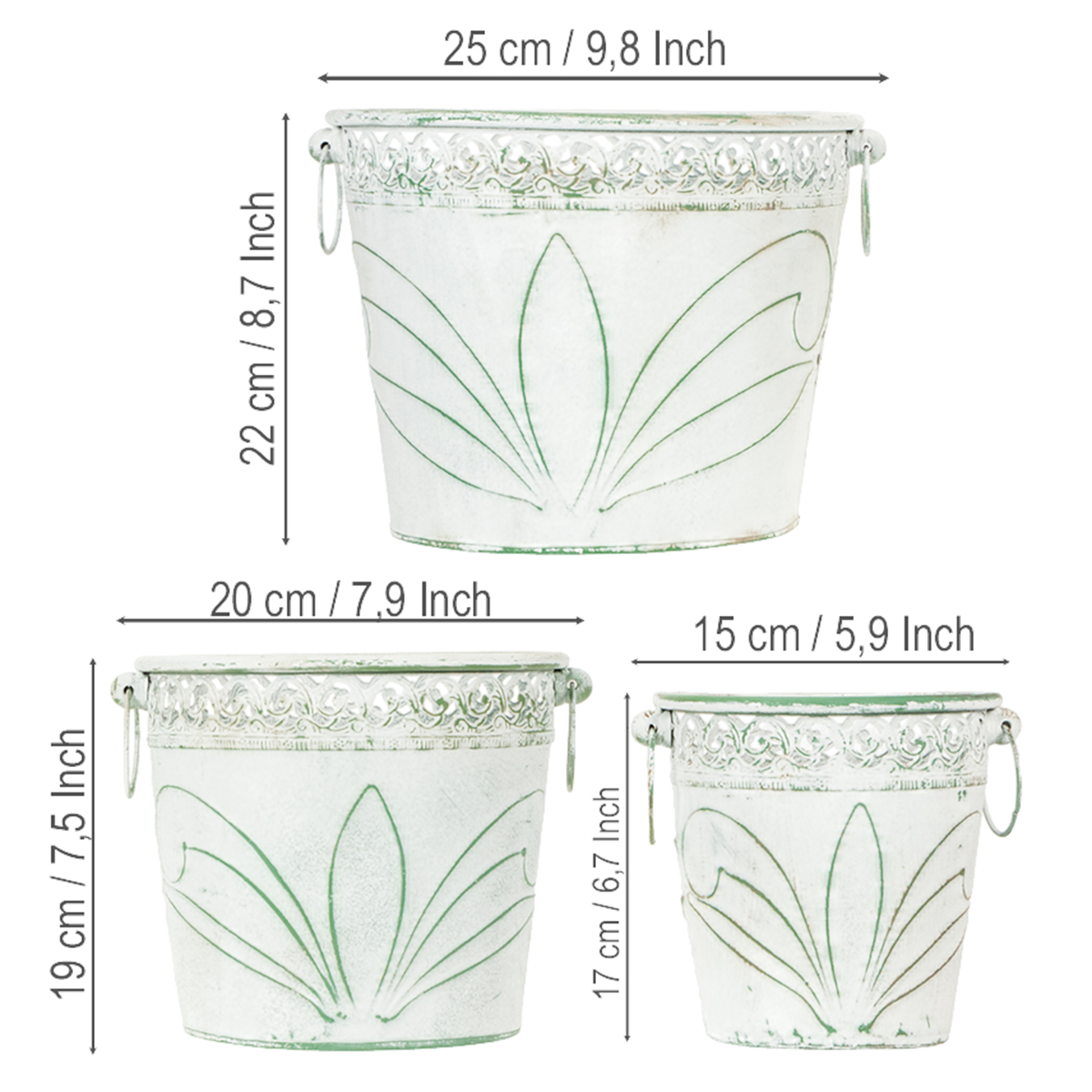 Embossed metal planter with handles, white and green, shabby chic style, H22/19.5/17.5cm, Ø25.5/20.5/15.5cm, set of 3