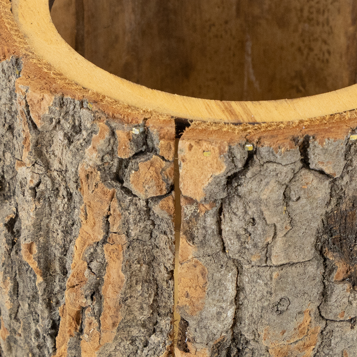 What looks like a small tree trunk for planting is a round container made out of pieces and pieces of wood put together. Different plants can be used through the opening at the top.