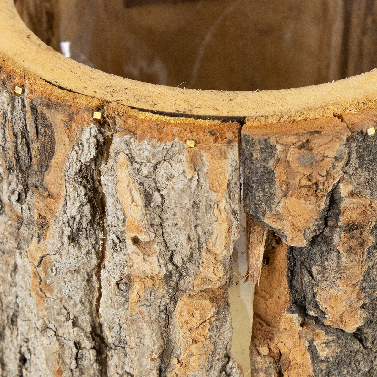 The round pot consists of composite tree bark, which gives it this unusual look.