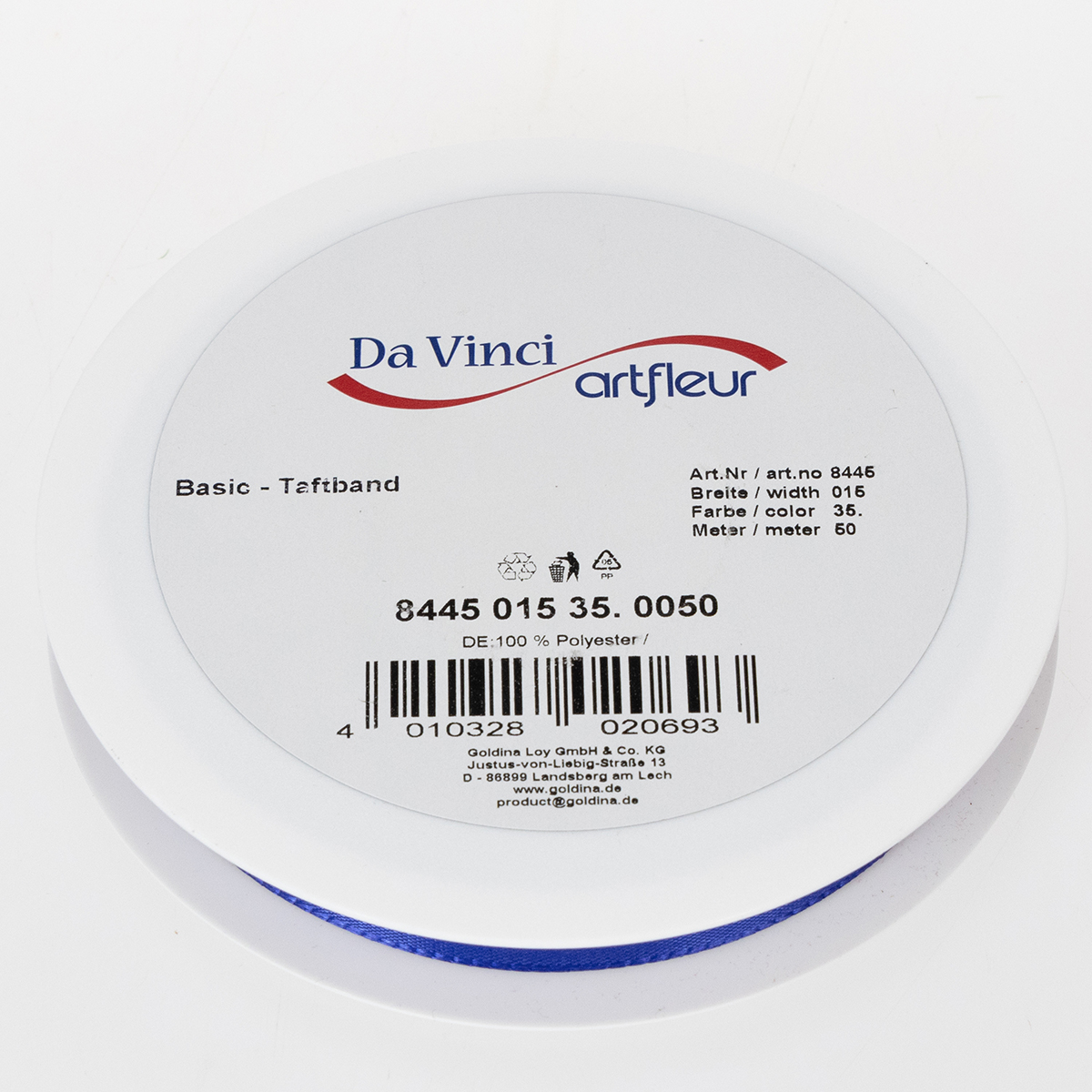 This pretty dark blue gift and decoration ribbon is approximately 15 millimeters wide and approximately 50 meters long. It is made of 100% polyester and comes on a handy, flat plastic spool.