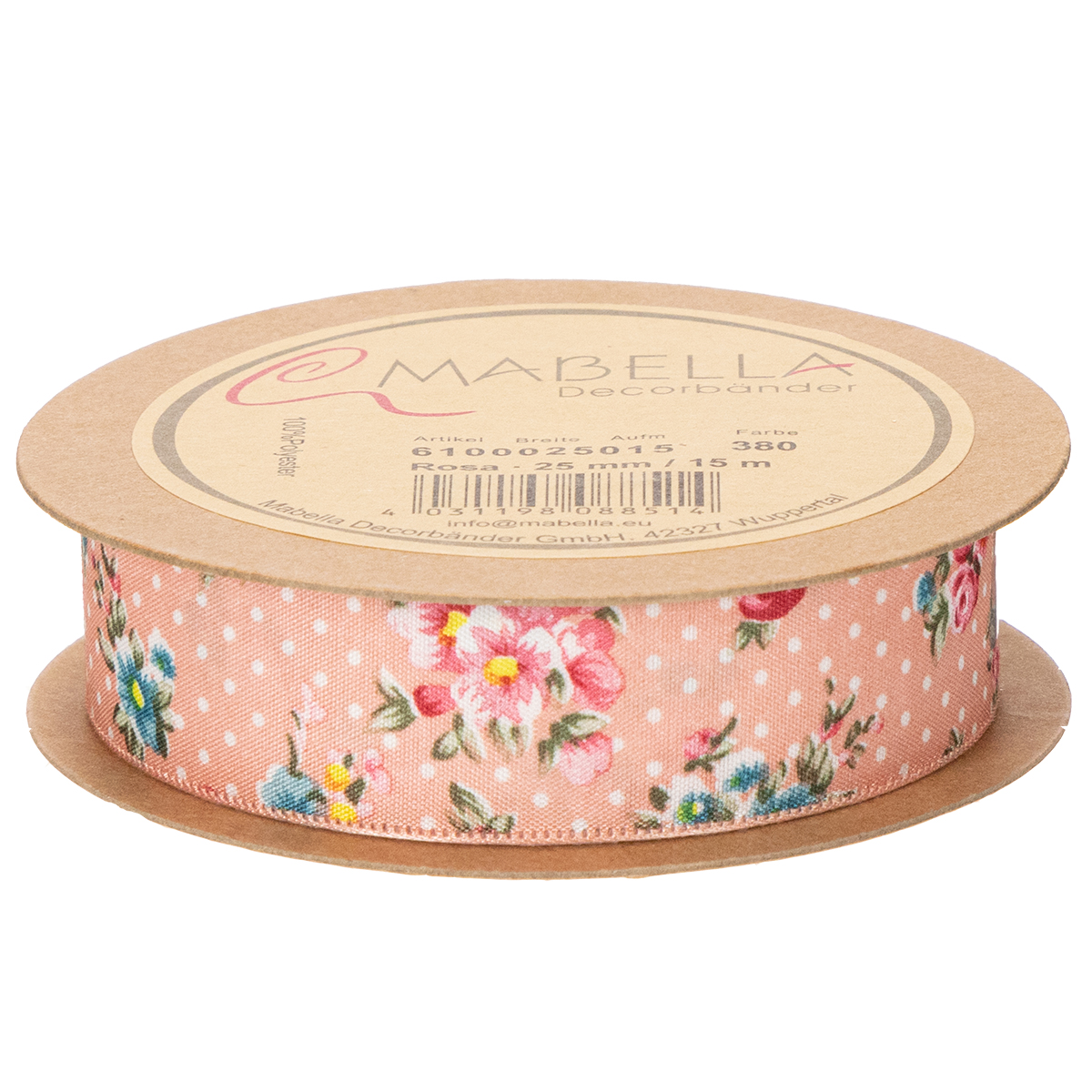 Gift ribbon with floral pattern for playful gifts and crafts, 2.5cm wide, 15m long