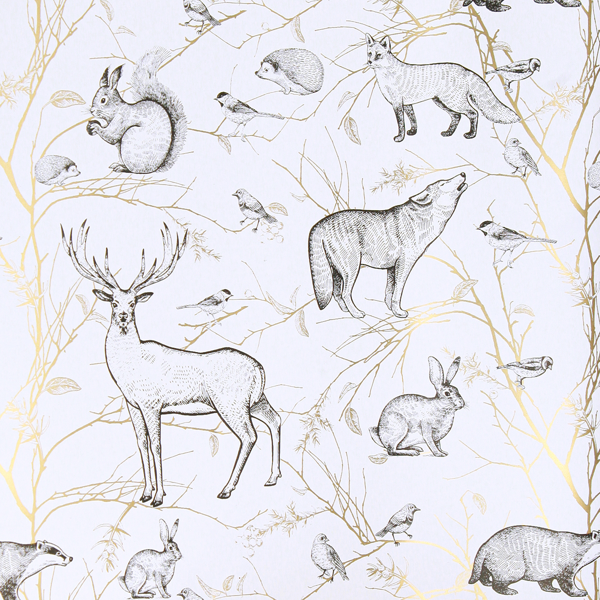 White wrapping paper with black-grey animals and golden branches – perfect for autumn and winter gifts