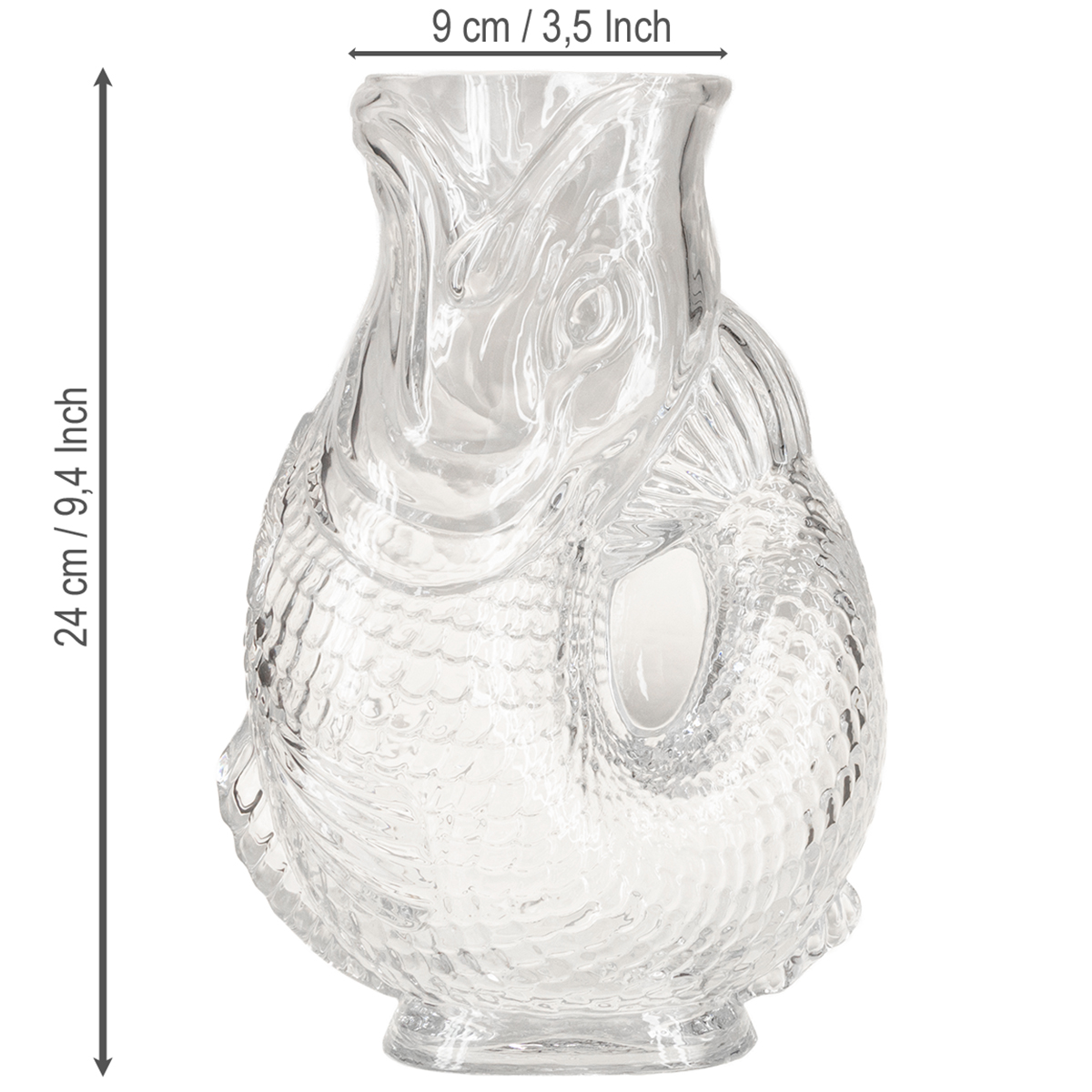 Looking for a unique accent for your interior? This glass vase with its decorative fish design will add a personal touch to your home. Whether on the dining table, windowsill, or in the bathroom, the transparent glass vase with its charming fish motif complements a variety of interior design styles. Its delicate craftsmanship, reminiscent of sparkling water, is sure to impress and brings a touch of maritime flair to any room. At 24.5 cm tall, it's particularly versatile and ideal for single flowers, branches, or small floral arrangements. With its understated elegance, this vase is sure to catch the eye.