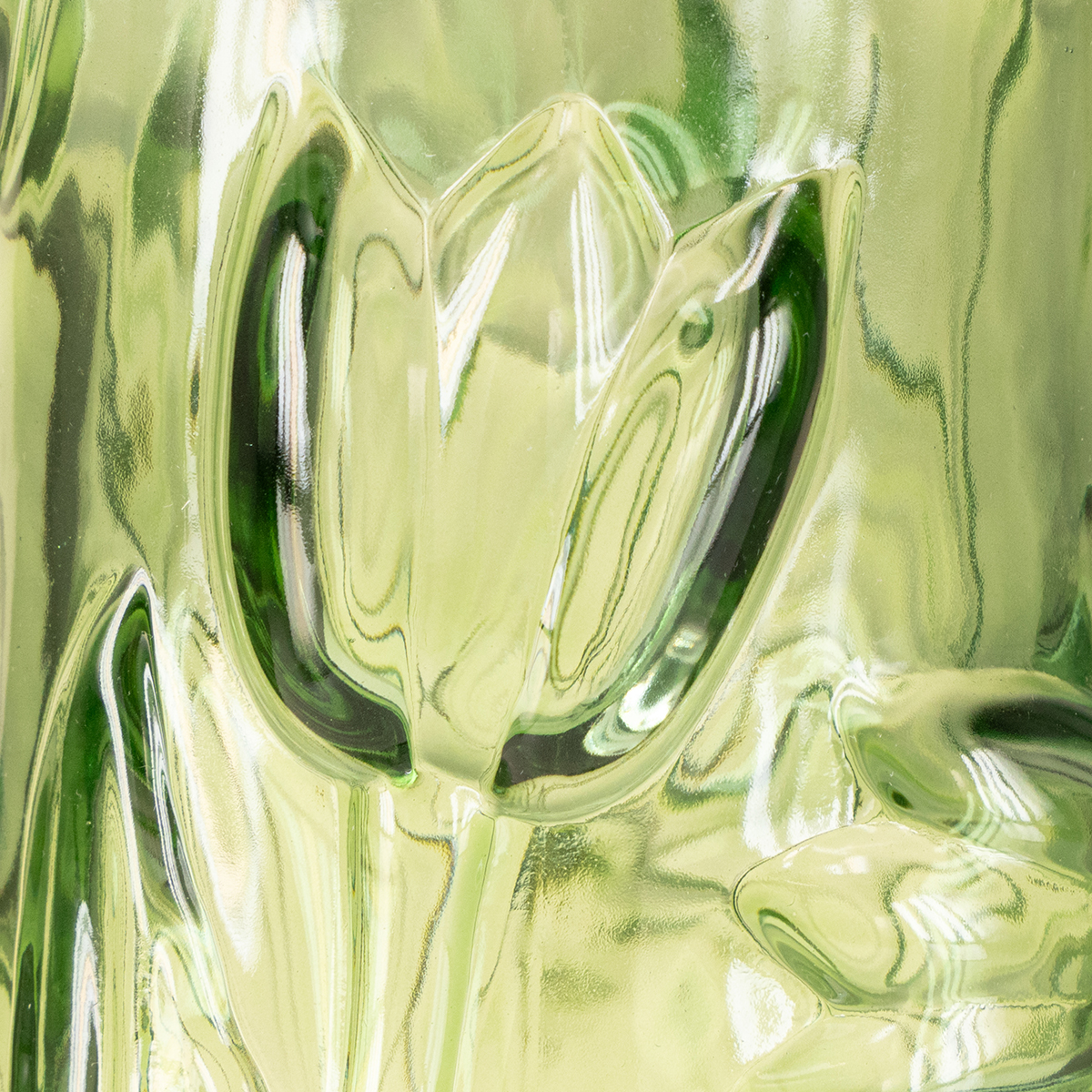 Looking for a vase that's not only practical but also a real eye-catcher? Our 30 cm tall glass vase with an embossed tulip design could be just what your room is missing. Imagine this delicate green piece on your dining table, displaying fresh flowers, or creating a welcoming atmosphere in your entryway. The transparent glass, combined with the detailed tulip texture, gives the vase a modern yet natural look. Whether as the centerpiece of your interior design or as a subtle accent, this vase will bring style and harmony to your home!