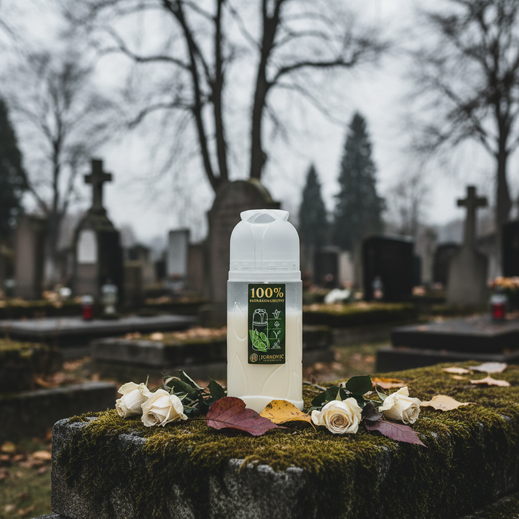 The Ecoterra grave candle combines traditional values with environmentally friendly awareness. Made from high-quality wax made from vegetable oil, this candle not only burns cleanly, but also conserves resources. The cotton wick ensures even burning without soot over a period of up to four days.
